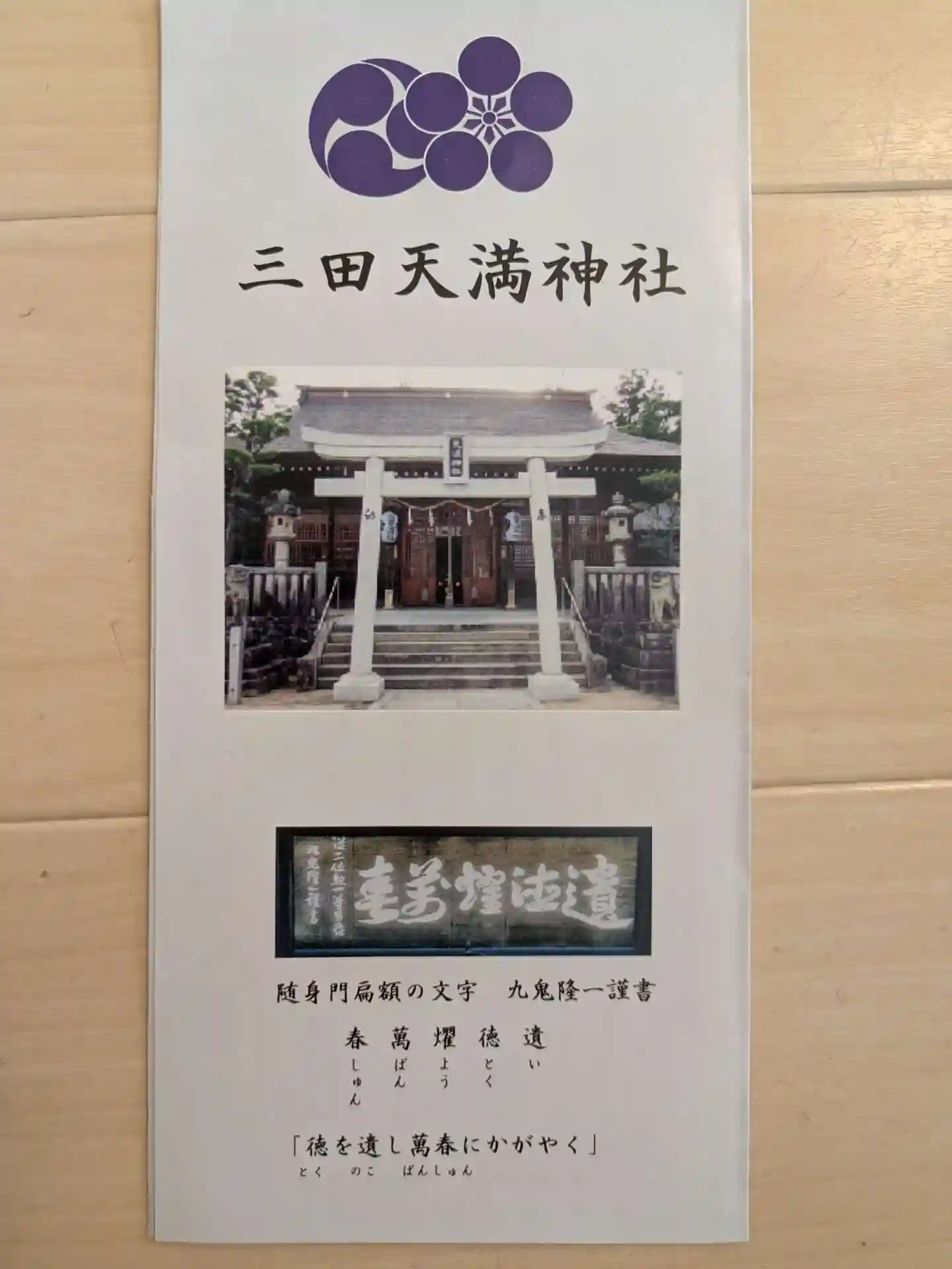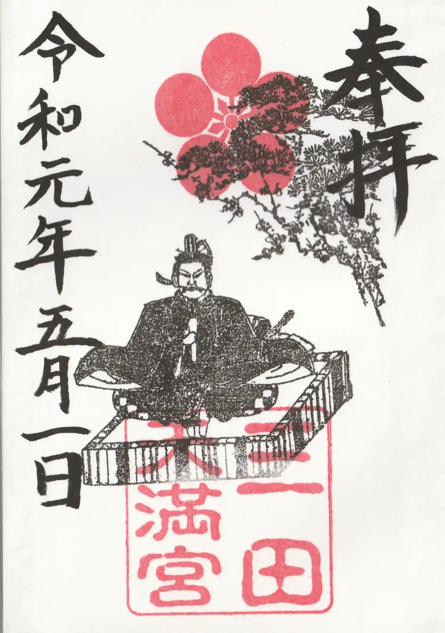 御祭神の菅原道真公のお姿印が押印せれていますが昔に木彫りの印が出てきたそうでさらに松と梅が描かれているのに意味があり、京都の北野天満宮と同じとの事で謂れがあるそうです。