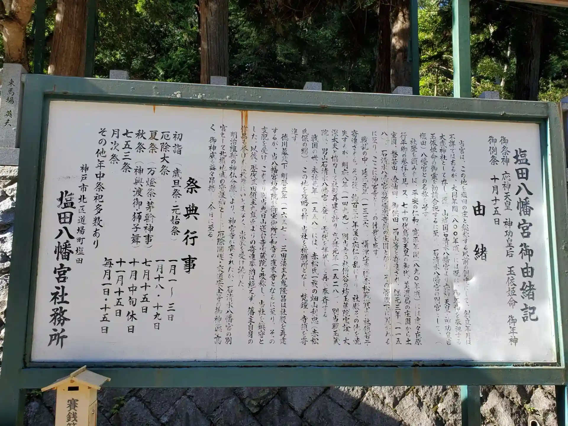 守護職赤松氏の尊崇は歴代篤く 戦陣に於いては常に当宮を祈願所とし 寺社領のみに留まらず 梵鐘等の寄進も得 更には徳川幕府下 明暦3年(1657)社殿再建時には三田藩主 九鬼隆昌より浄財寄進があり 九鬼家当主代々よりの奉納 寄進が続いたものである