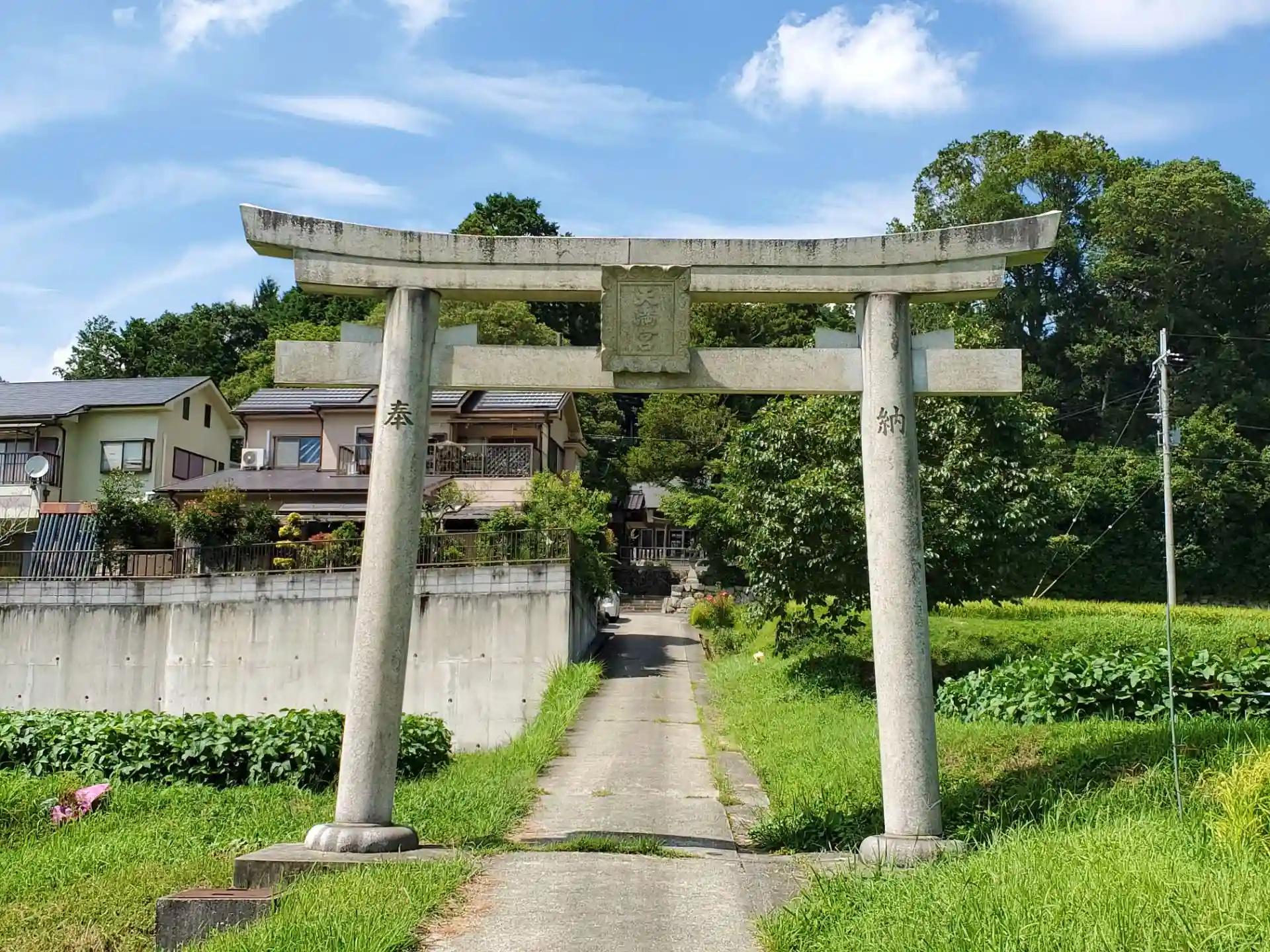 こちらの天満神社も「え?この鳥居がある細い参道を車で進むの?」って思いつつ、150mほど東へ行くと神社方向へ向かう道があり、思い切ってその道を進んでみると神社前に到着。