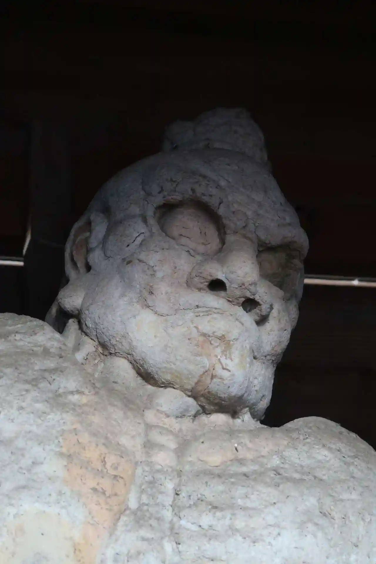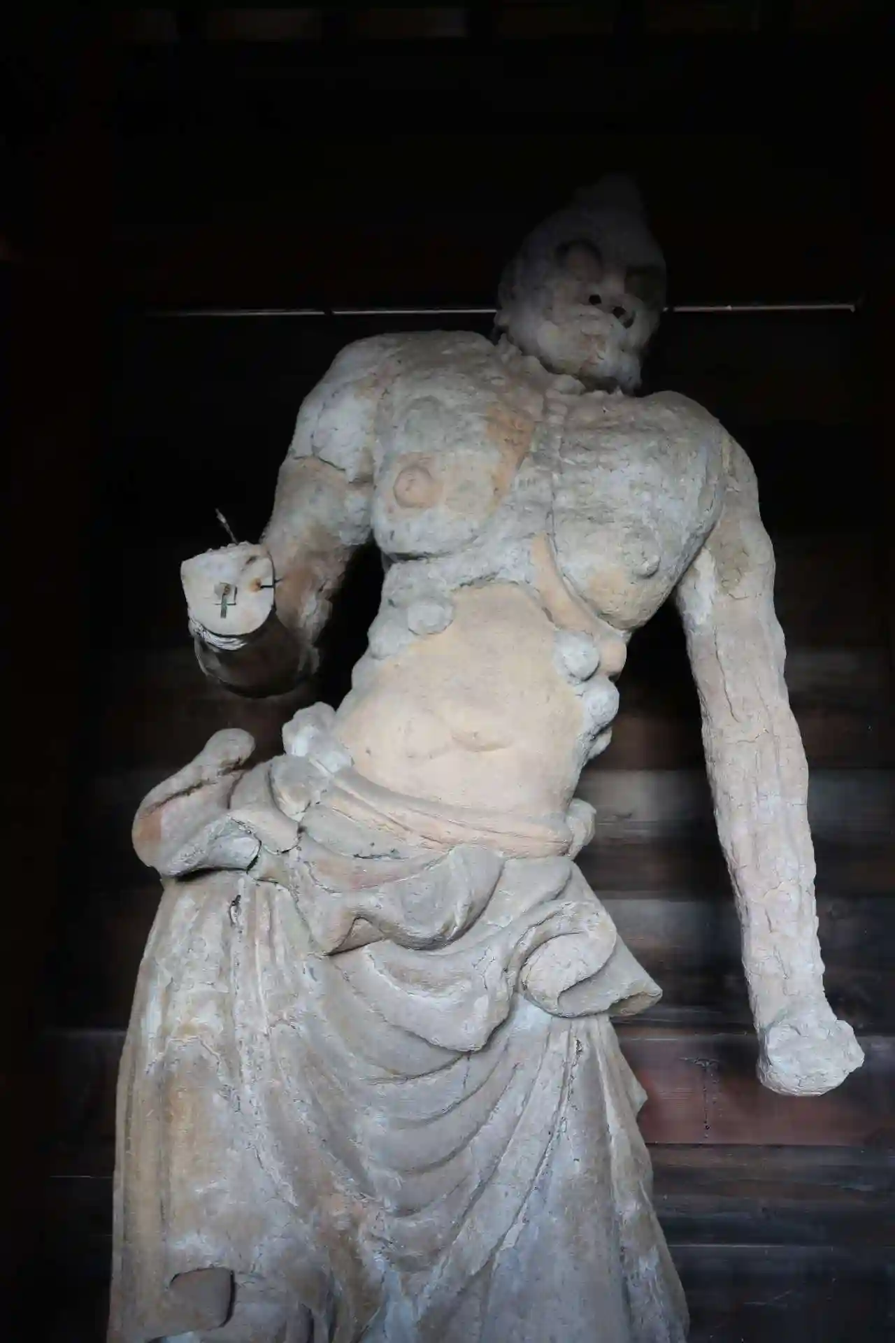 左側の右脚辺りを見ると板に紐が巻かれています。木像ではなく塑像なんです。