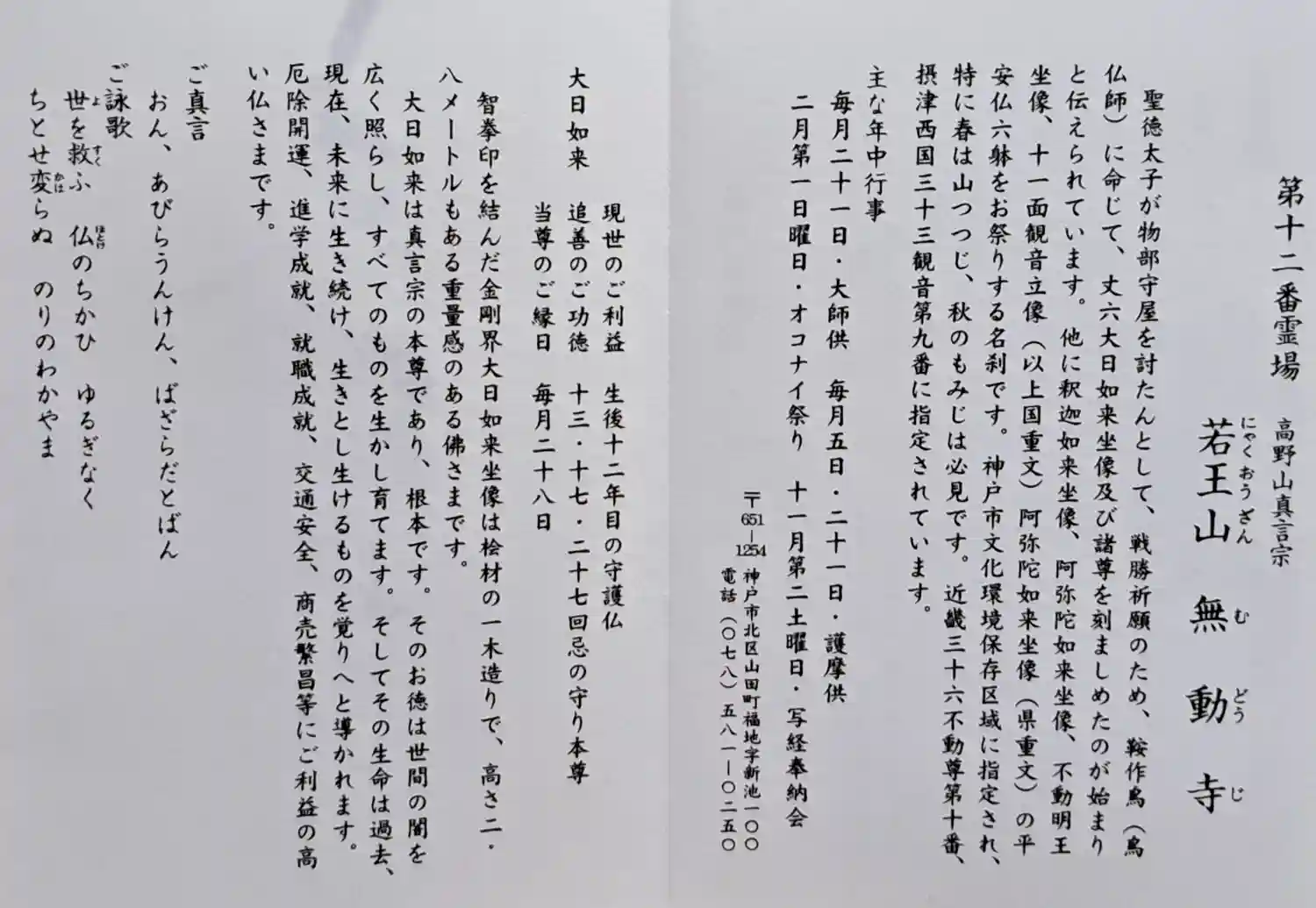 近畿三十六不動尊10番、神戸十三仏霊場12番、摂津国三十三箇所9番