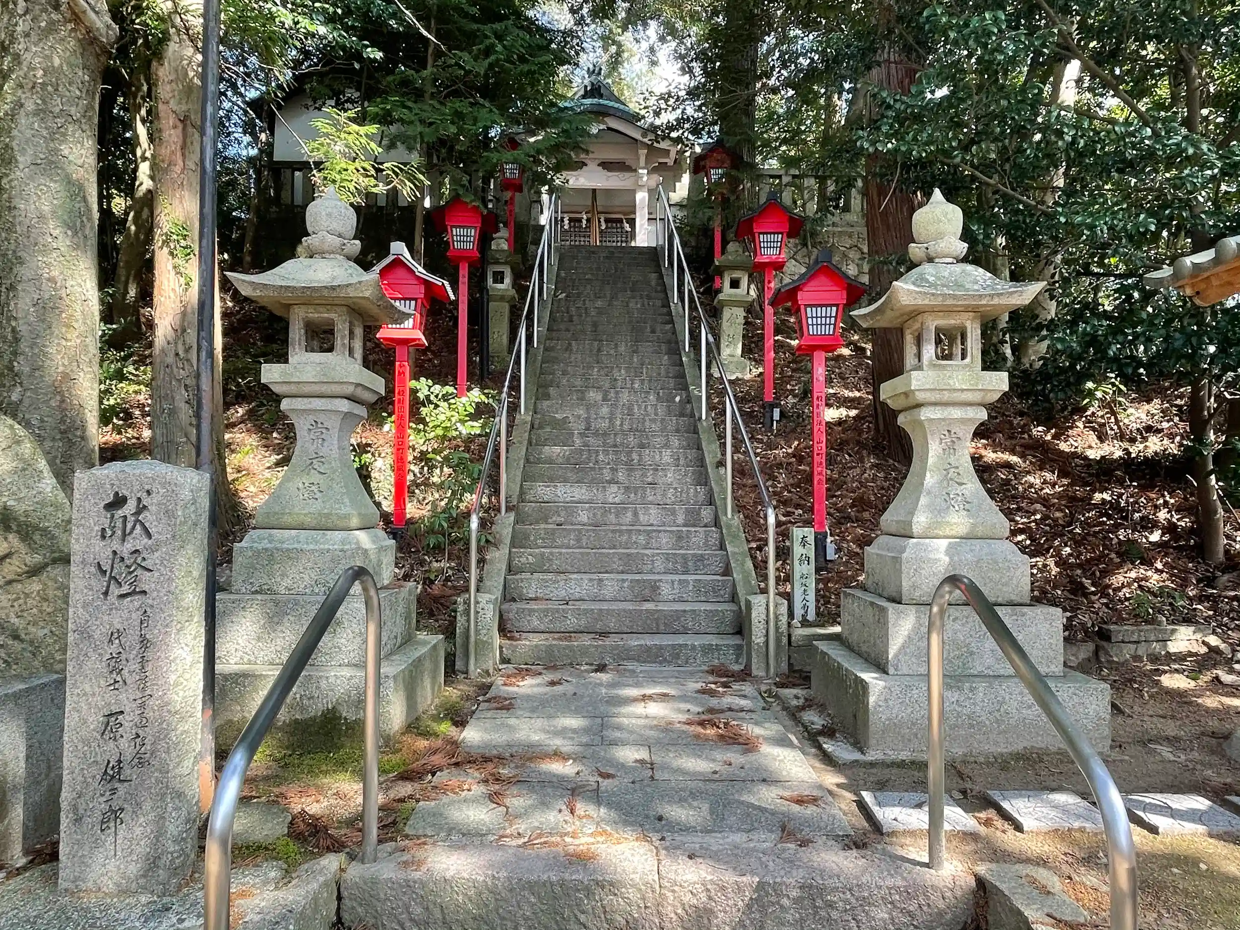 少しだけ階段登ってお手水、さらに階段で上へ。手すり付き。階段横に狛犬。