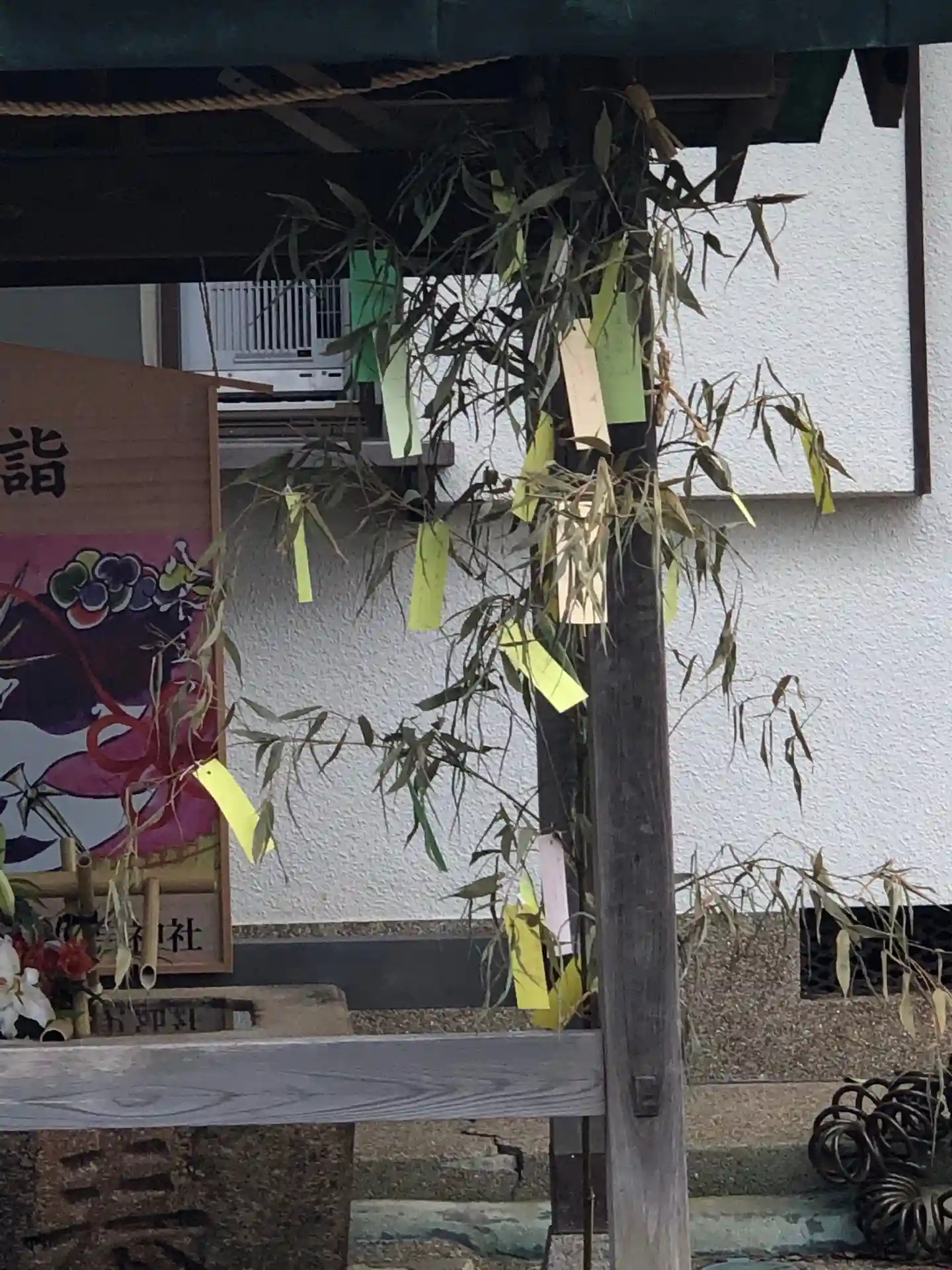 手水社の柱に取り付けてある笹の葉です。短冊がつけられていました。