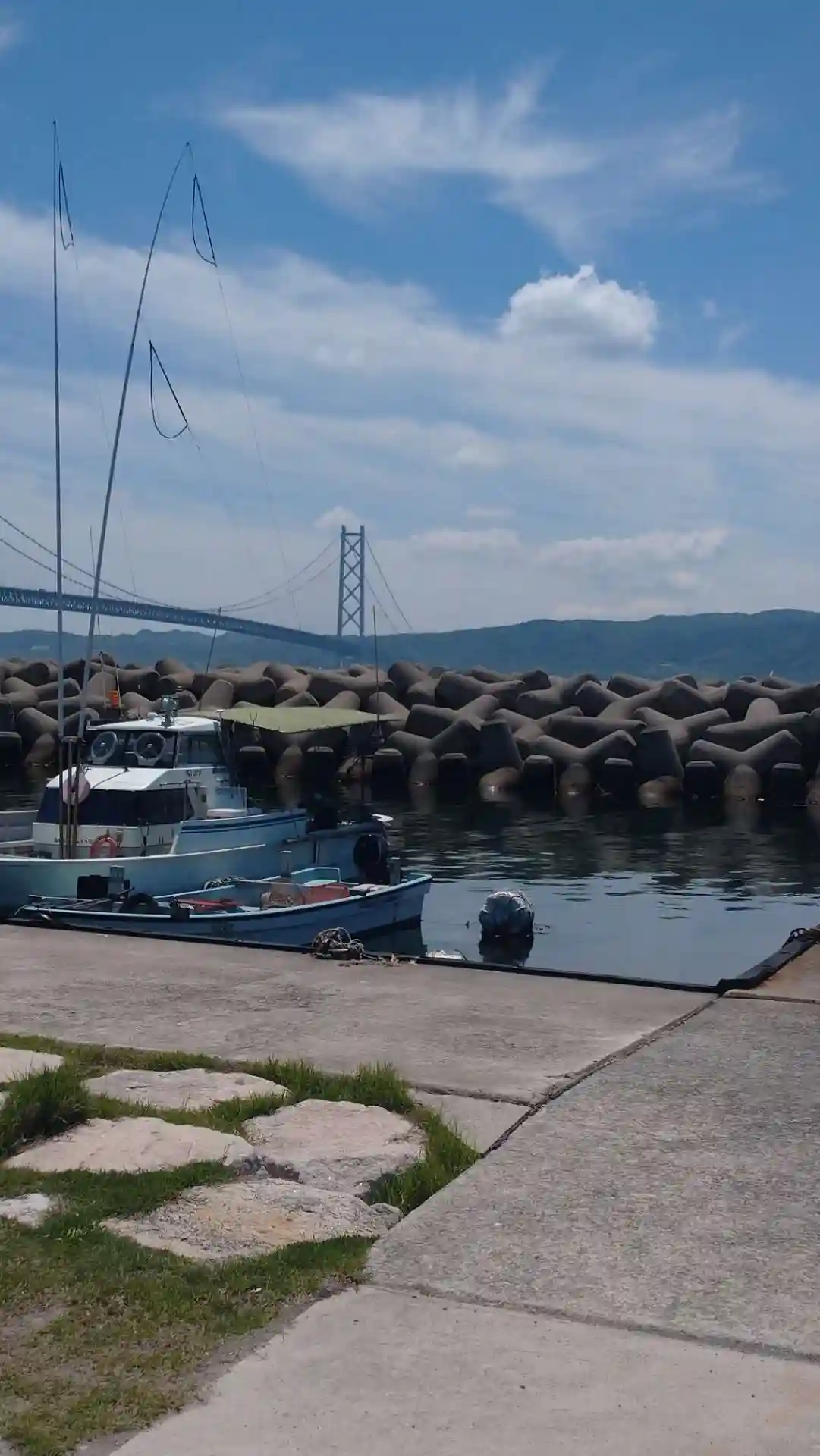 淡路島と明石海峡大橋です。雨雲がかぶってました。海も波が立ってました。