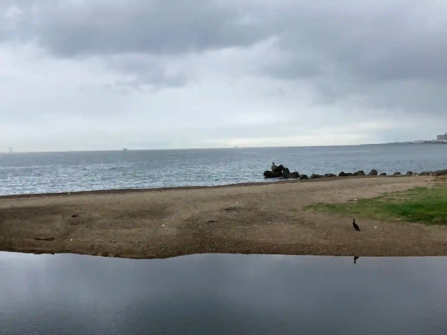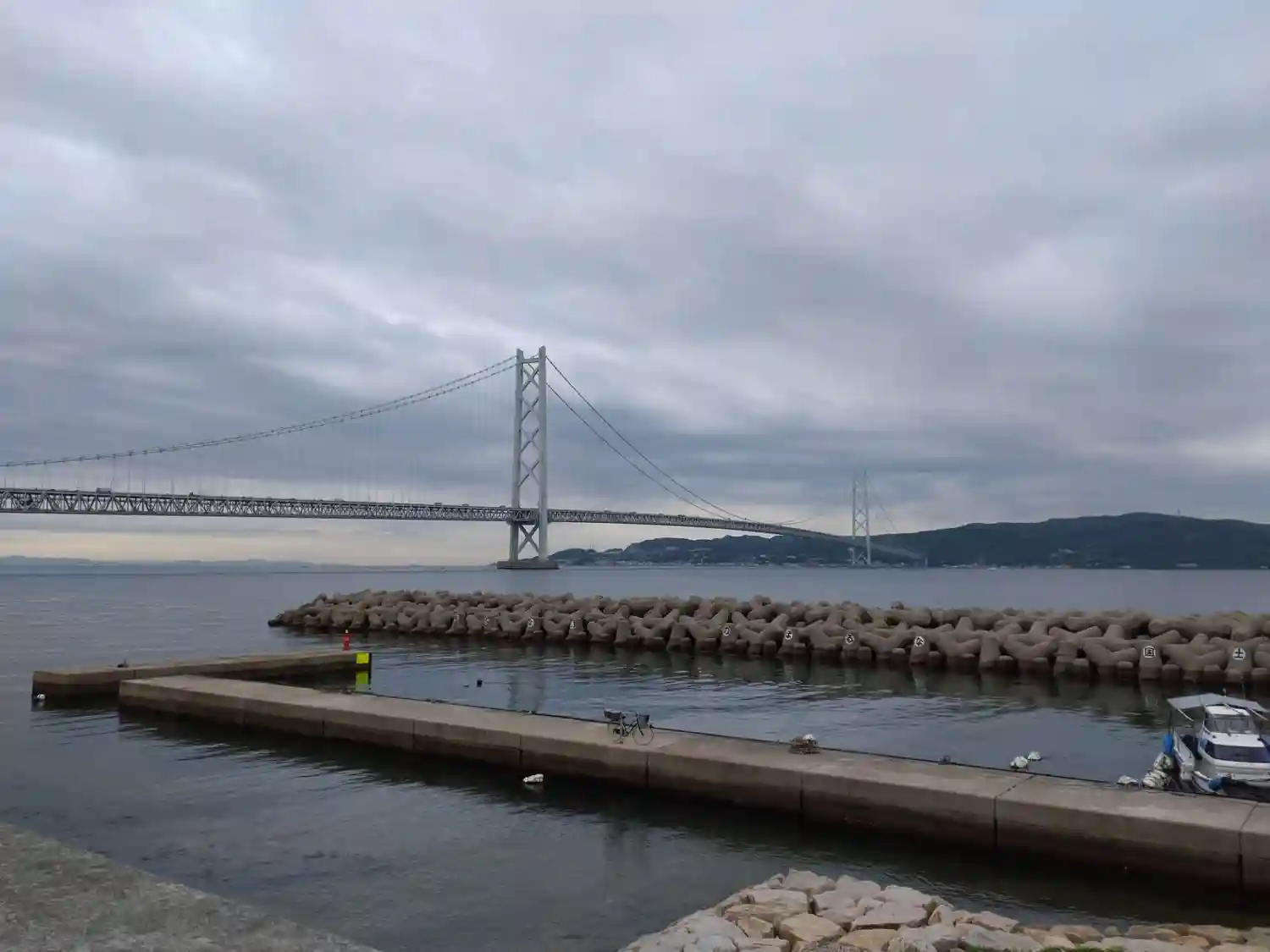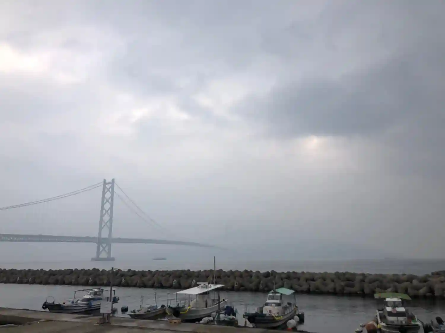 淡路島と明石海峡大橋です。雨雲がかぶってました。海も波が立ってました。