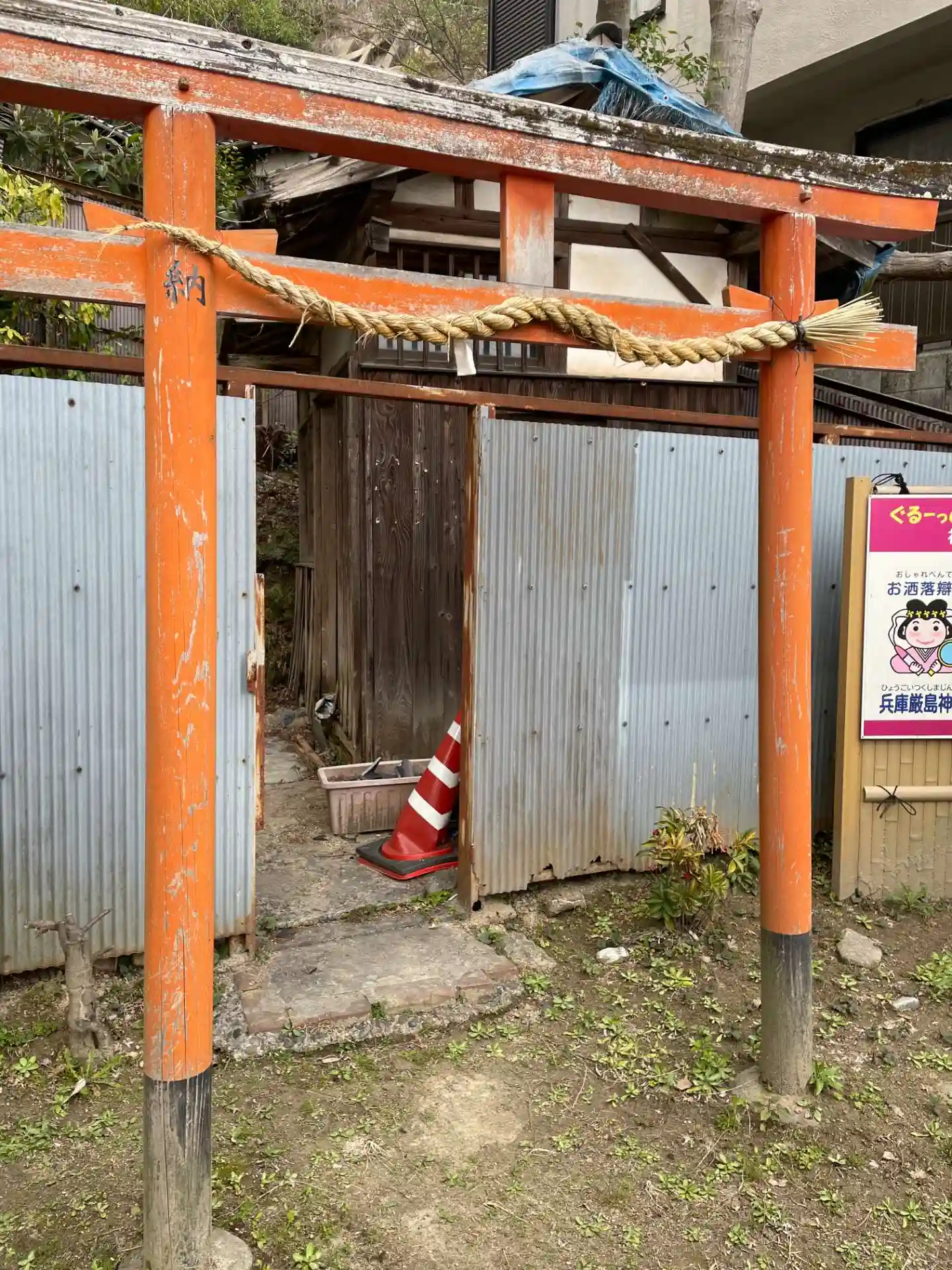 トタン板の前に鳥居がありました。