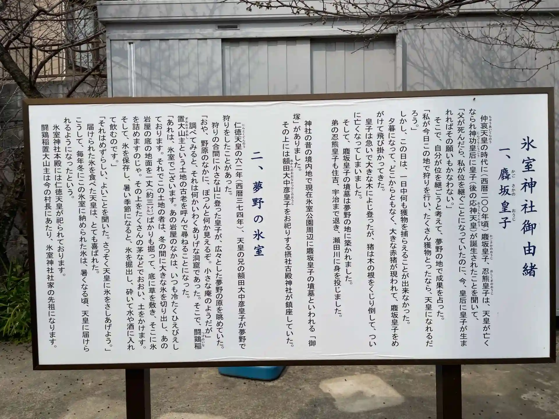 神社の昔の境内地で現在氷室公園周辺に麛坂皇子の墳墓といわれる「御塚」がありました。