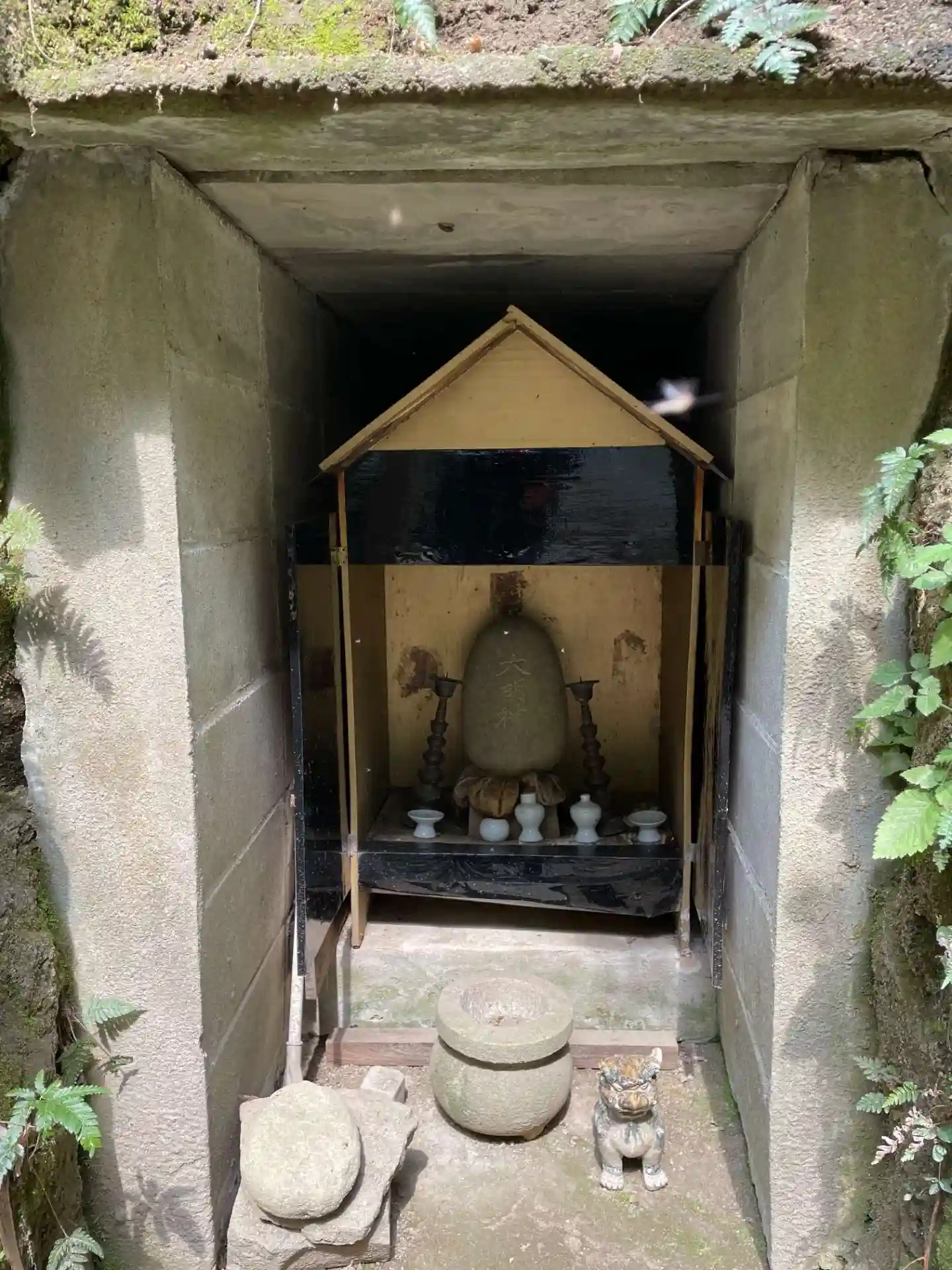 コンクリで固められた中に 祠のようなものがあり 中に「大明神」と書かれた石が置いてあります。