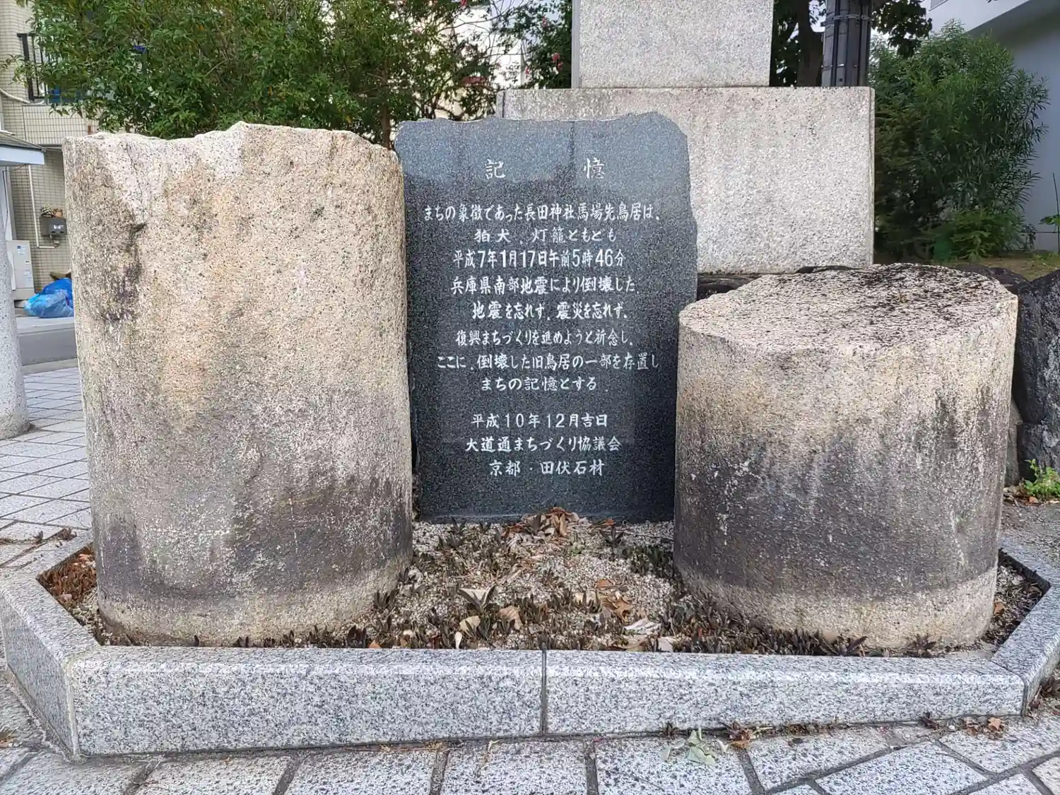 震災遺構。阪神淡路大震災で倒壊した馬場先鳥居。