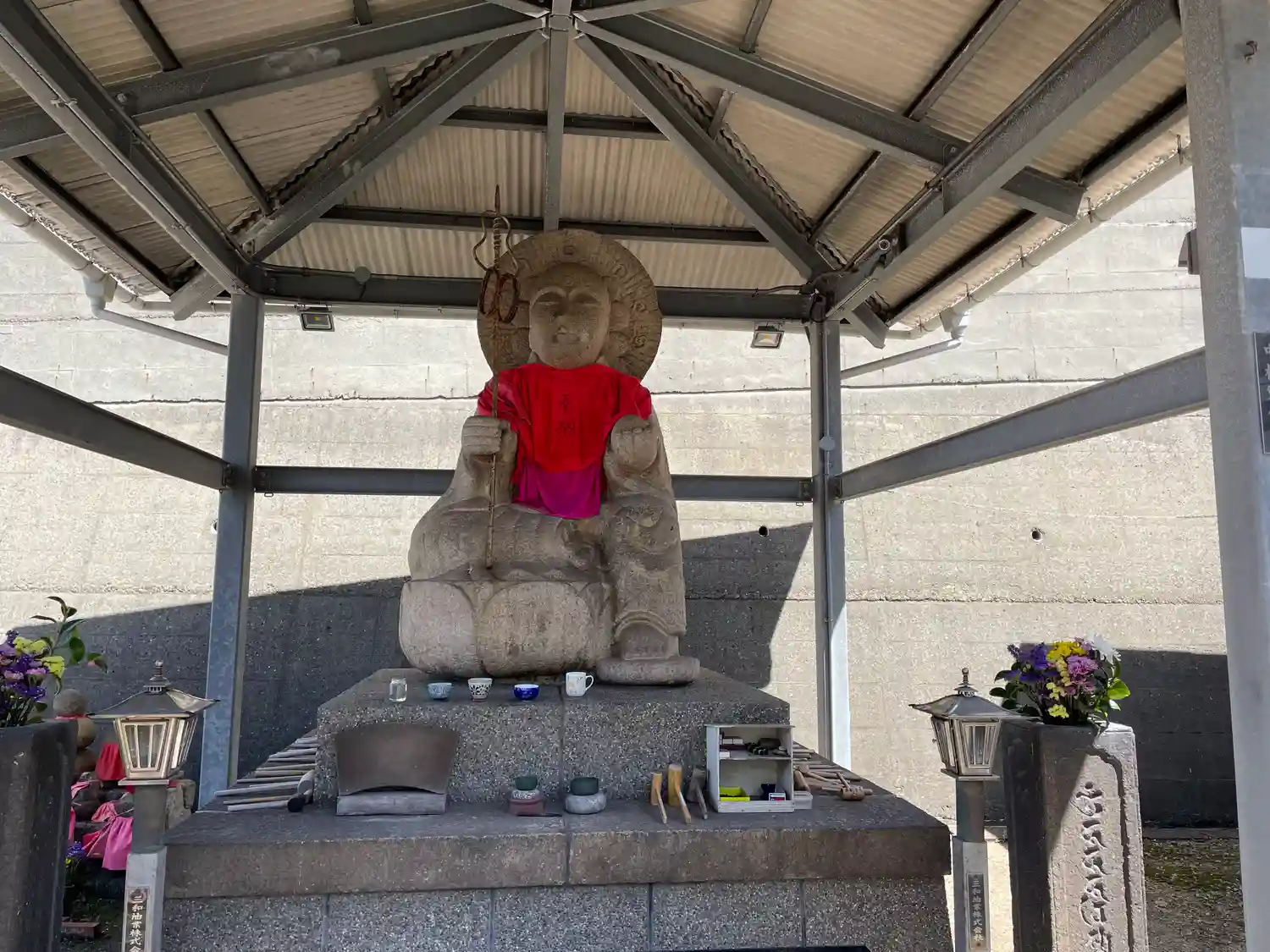 かなり大きなお地蔵様で、坐像です。夕暮れでライトが当たっていましたが、お顔に当たらず少し畏れ多い感じになっていました。飛び出し注意と言っていそうな気がします。