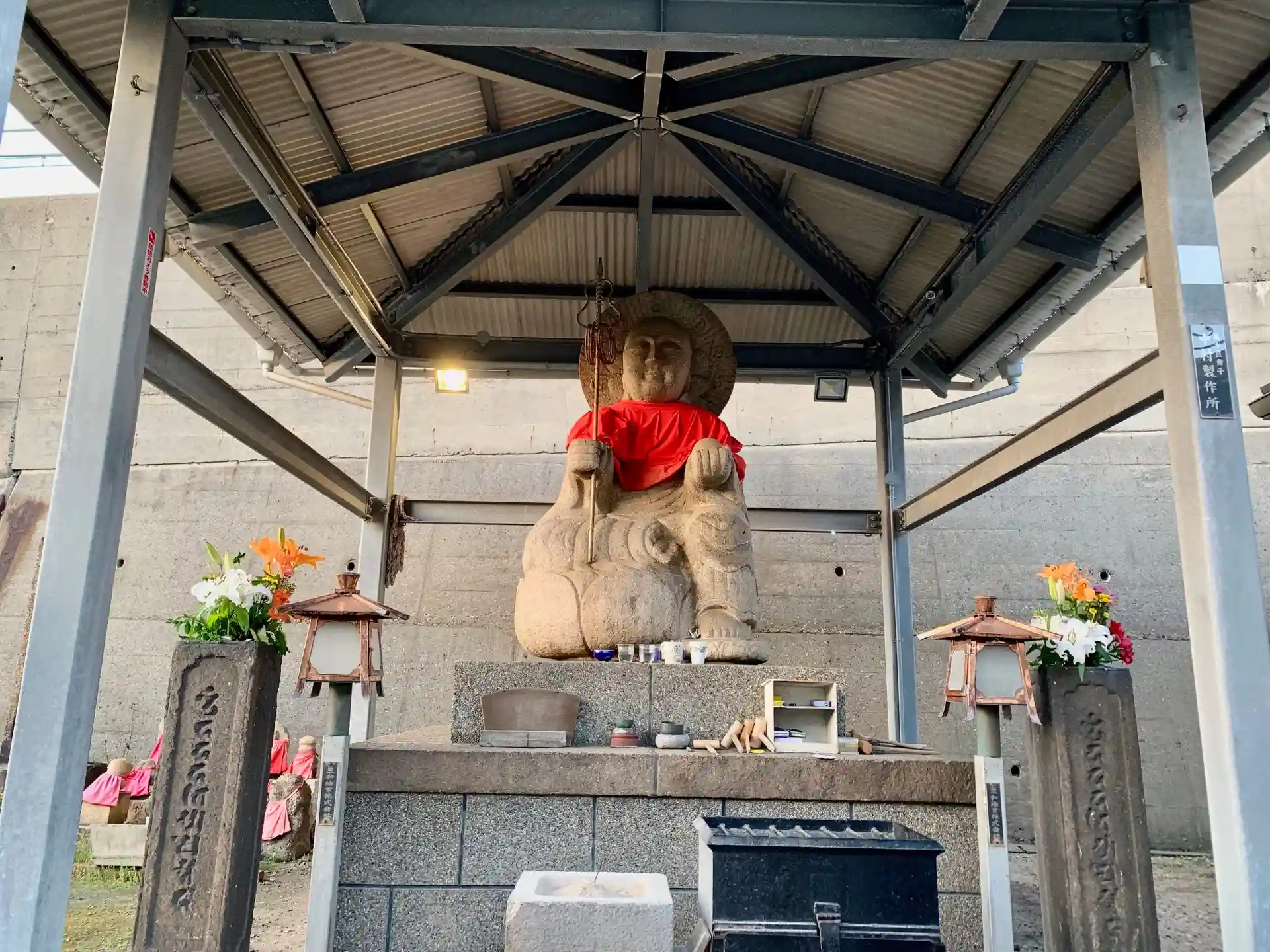 屋根付の建物に、大きなお地蔵さん。後ろはJRの線路。
