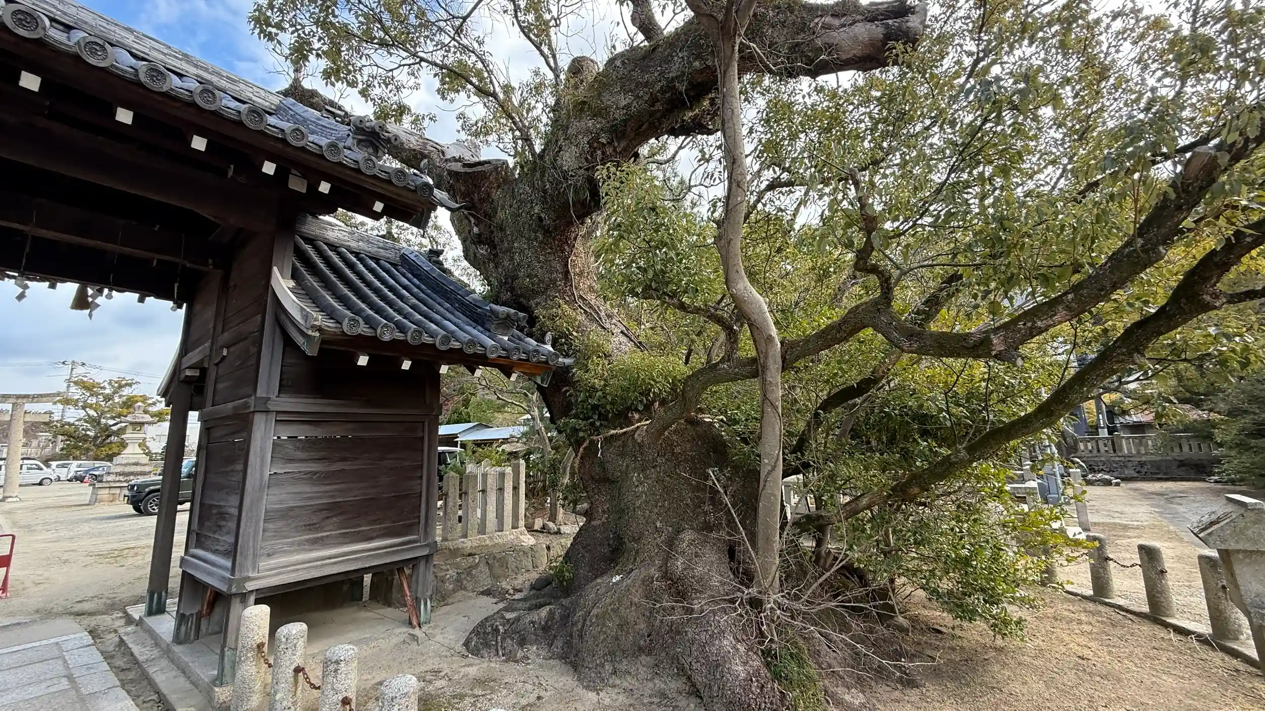 主祭神 蜂須賀家政公。めちゃめちゃ読みにくい神社名です、本殿越し洲本城も見えます、神門の横のヒノキも素晴らしいです