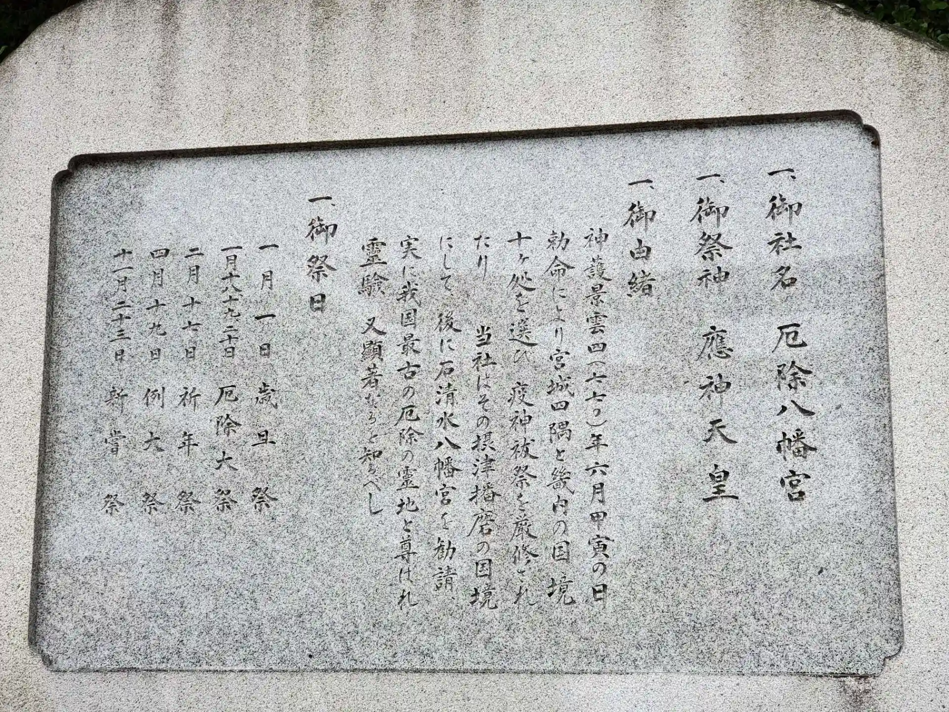 称徳天皇神護景雲4年6月勅旨を以って疫神祓いを行わせ給いし遺跡にして、高倉天皇安元年間、この霊地に京都石清水八幡宮を勧請し、爾来世人の崇敬篤く前田出雲守、明石候松平家、領主蒔田家も非常に崇敬せられ、現本殿(杮葺春日造、極彩色)は後村上天皇延文5年(約630年前)の建築にかかり、應永5年拝殿、長亨元年現本殿の覆い(前田出雲守親常寄進)を建築、近年に到るまで境内は拡張され社殿は整備し益々壮厳を加わるに至れり。