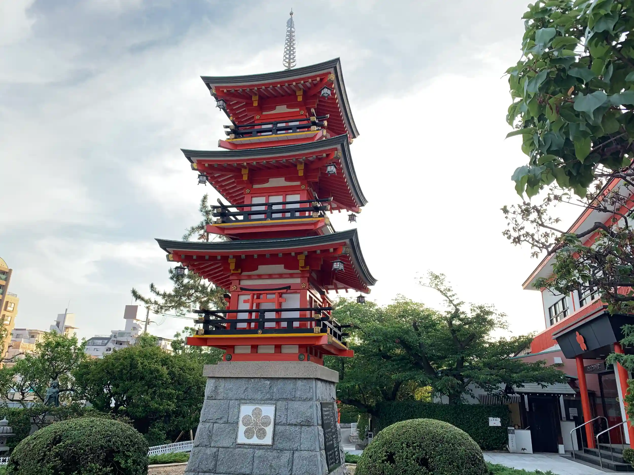 拝殿左側に社務所と塔。拝殿右側奥に祖霊社。