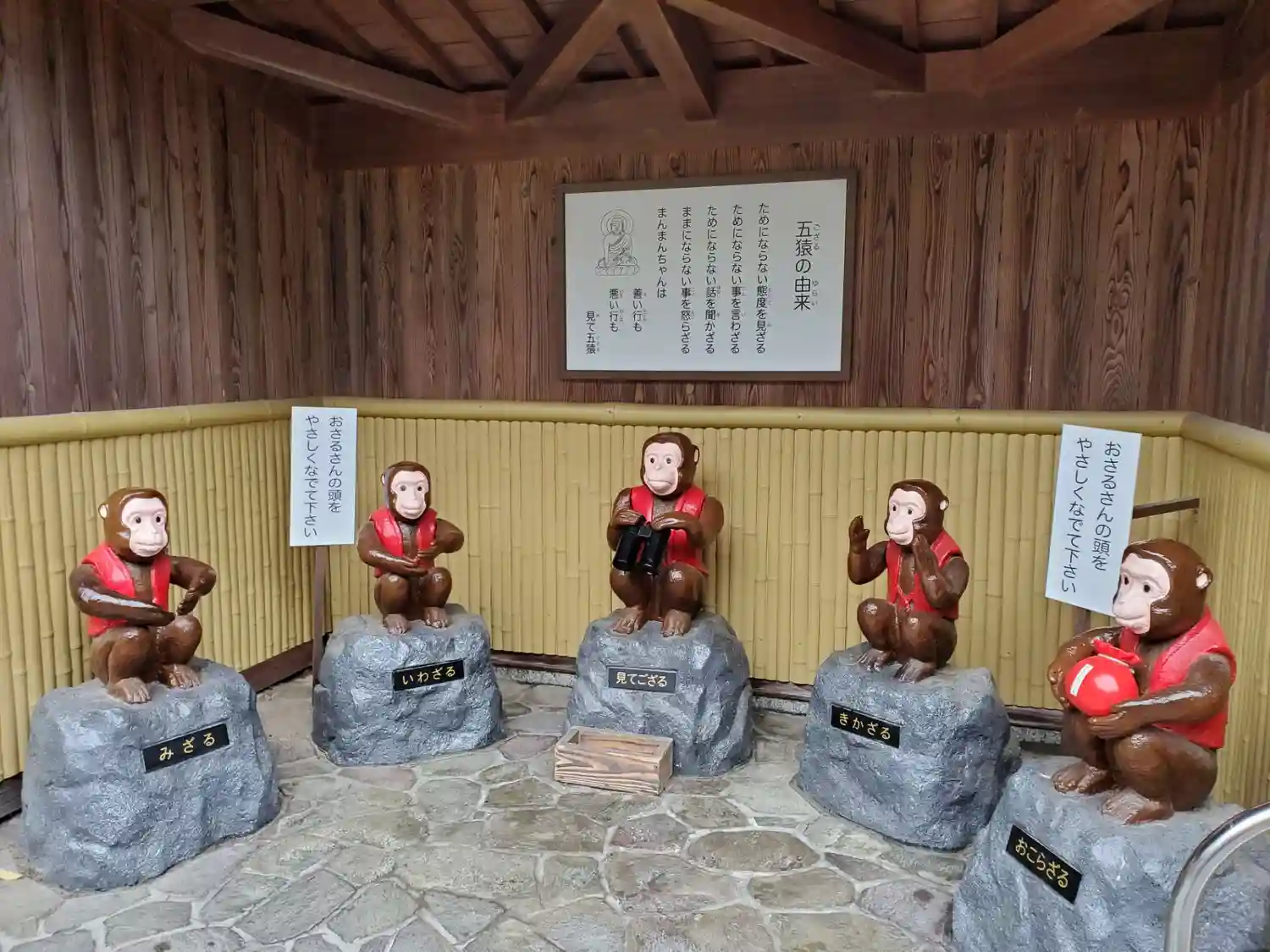見ざる、言わざる、聞かざるに加え、見てござる、おこらざる。中央のサルが双眼鏡で見てござる。