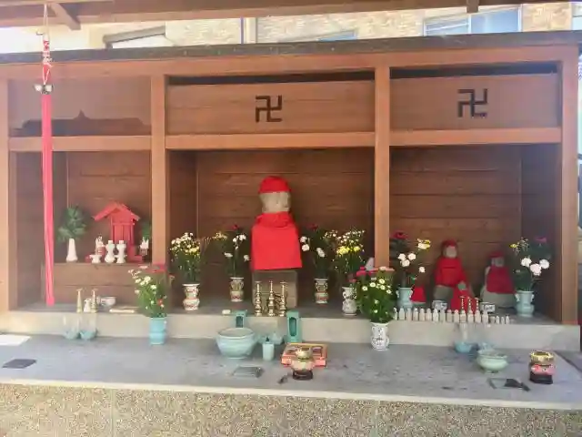 奥に赤い帽子をかぶったお地蔵さん、そこを中心に小さな同じく赤い帽子をかぶったお地蔵さんがたくさんいらっしゃる。