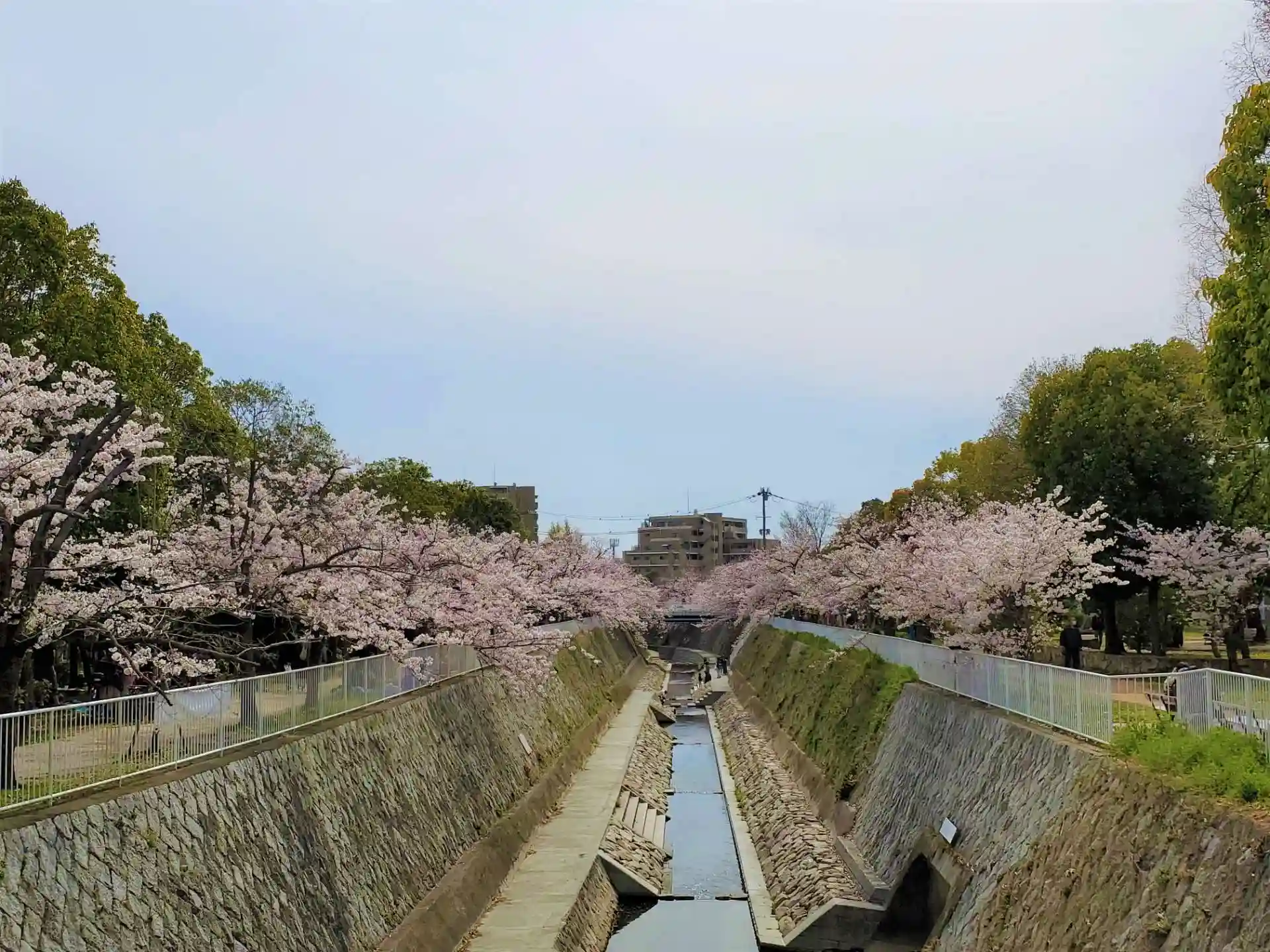 その川沿いには多くの桜の木が植えられていて、たくさんの家族連れなど花見で賑わっていました。