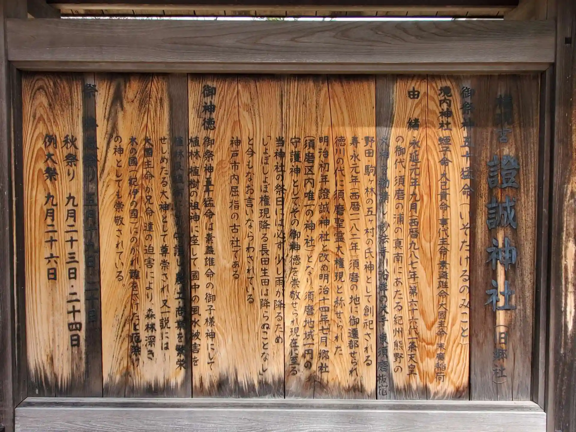 永延元年(987年)に紀伊熊野の大神を勧請し、妙法寺川沿岸の大手・板宿・東須磨・野田・駒ケ林の五ケ村の氏神として創祀されました。