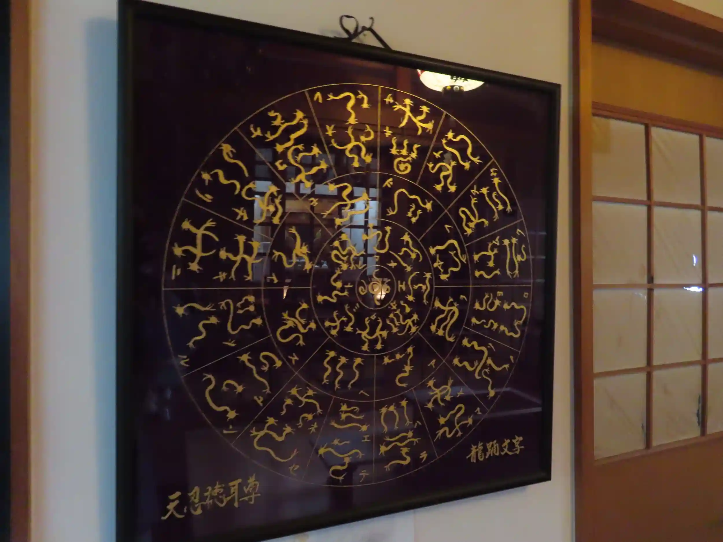 拝殿内には龍踊文字フトマニ図が架かっています。不思議な感じがします。