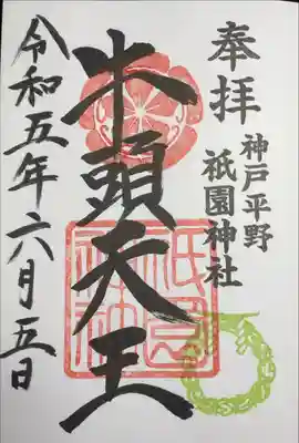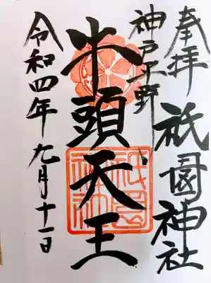 祇園さんのご朱印です。生田裔神八社の五宮神社のご朱印もここでいただけます。