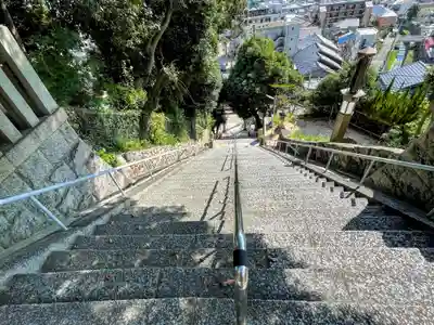 地元では「平野の祇園さん」と呼ばれて親しまれていますが、山の中腹にあり、高く長い石段があるため、躊躇していました。お祭りの時以外は、境内に車を乗り入れてもいいと聞き、雨の中ですがお参りしました。境内からは、神戸の街が一望できます。
