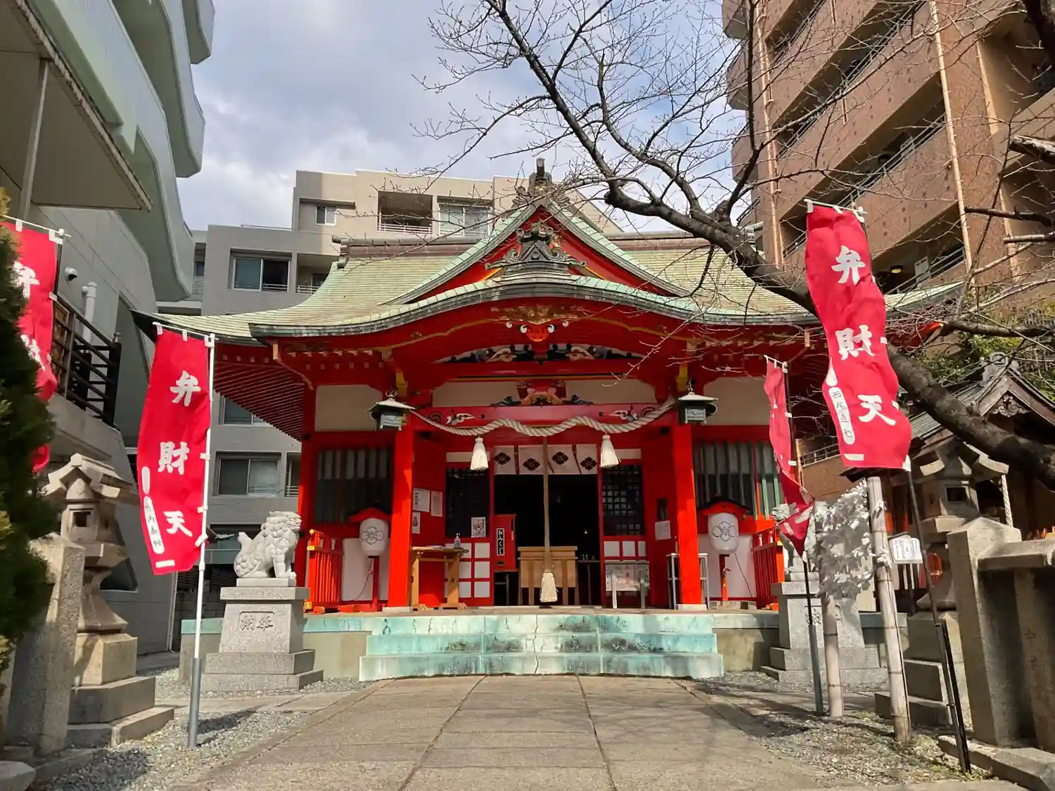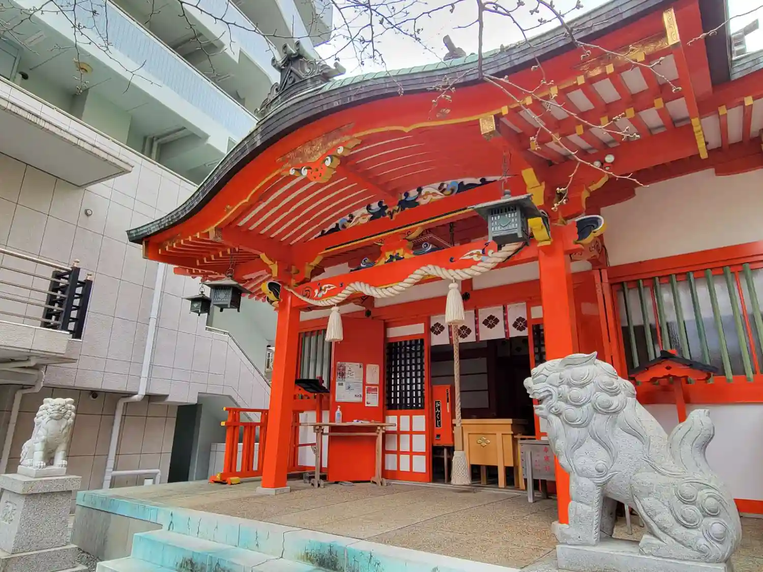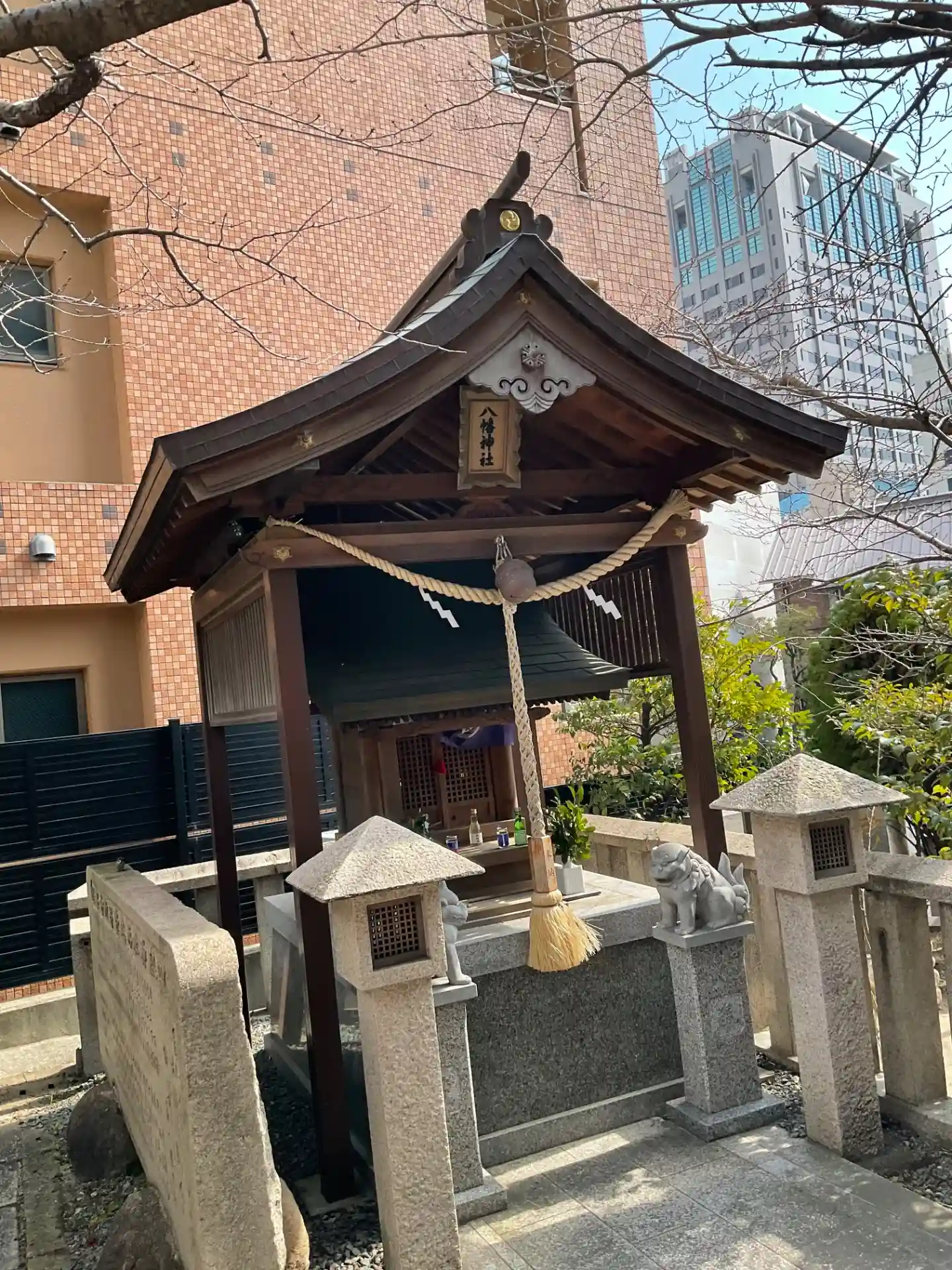 ビルに挟まれる形の境内
