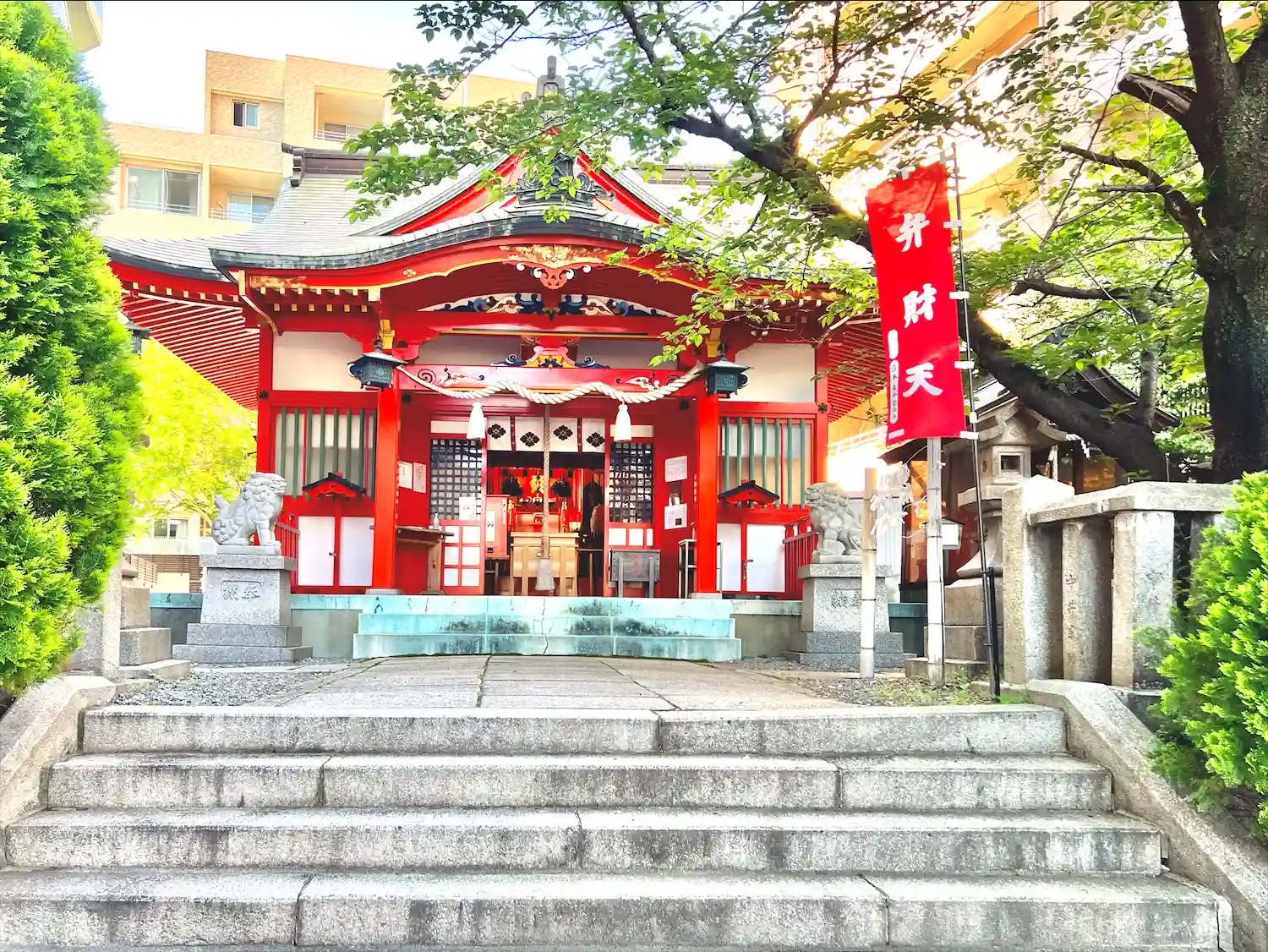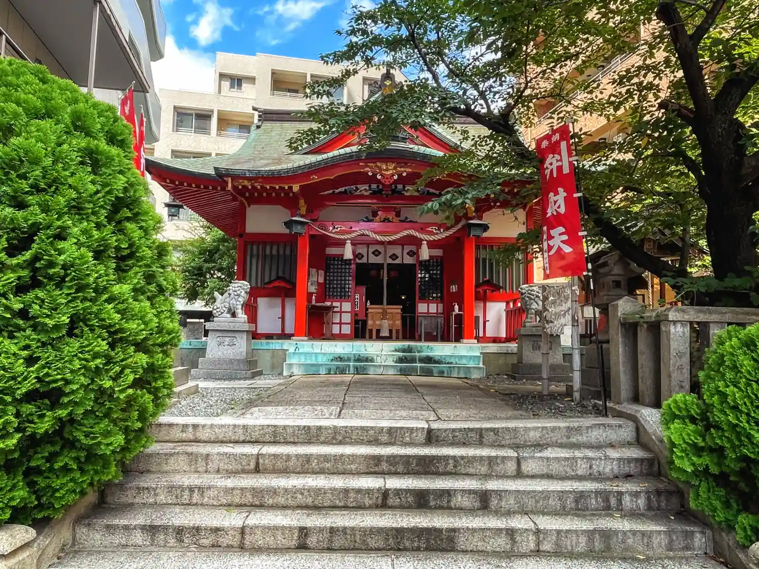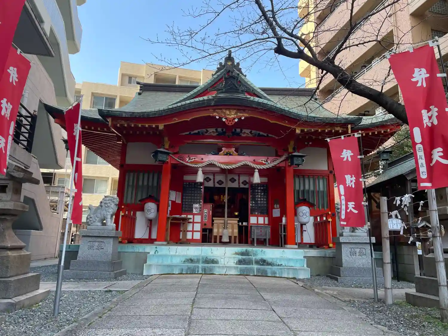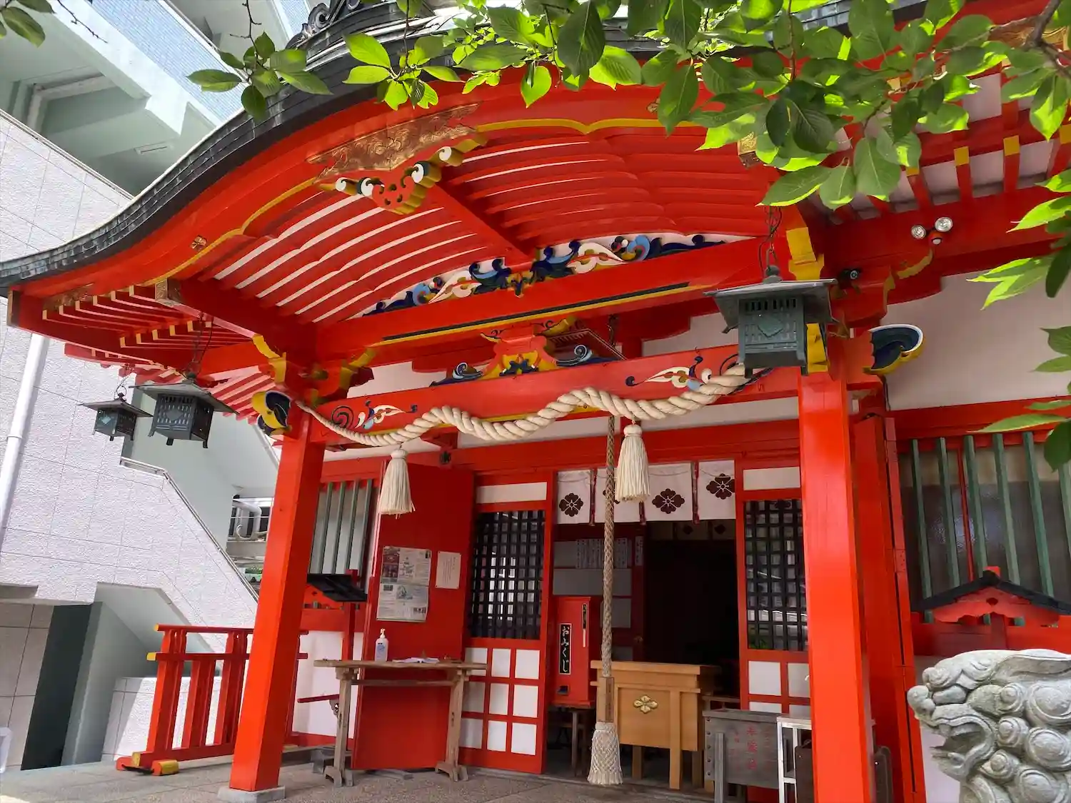 ビルに挟まれる形の境内