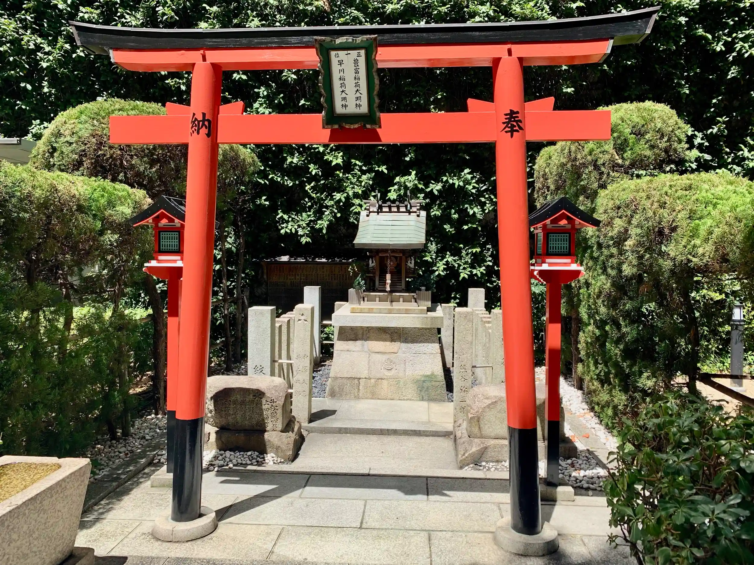 朱色の鳥居前には御手水あり(水出ない)、鳥居の扁額に「正一位豊富稲荷大明神・早川稲荷大明神」と2つの神社の名前が刻まれる。
