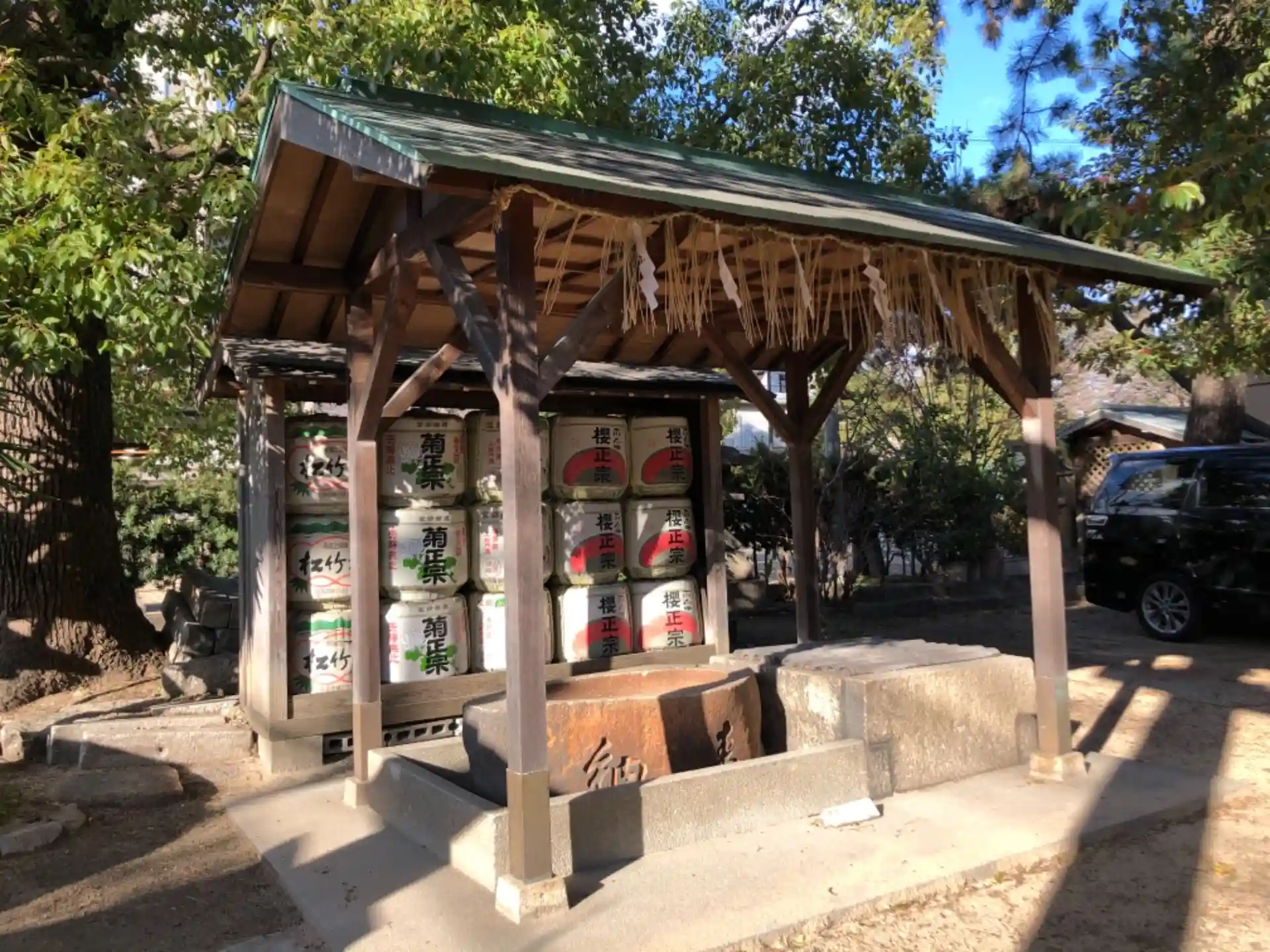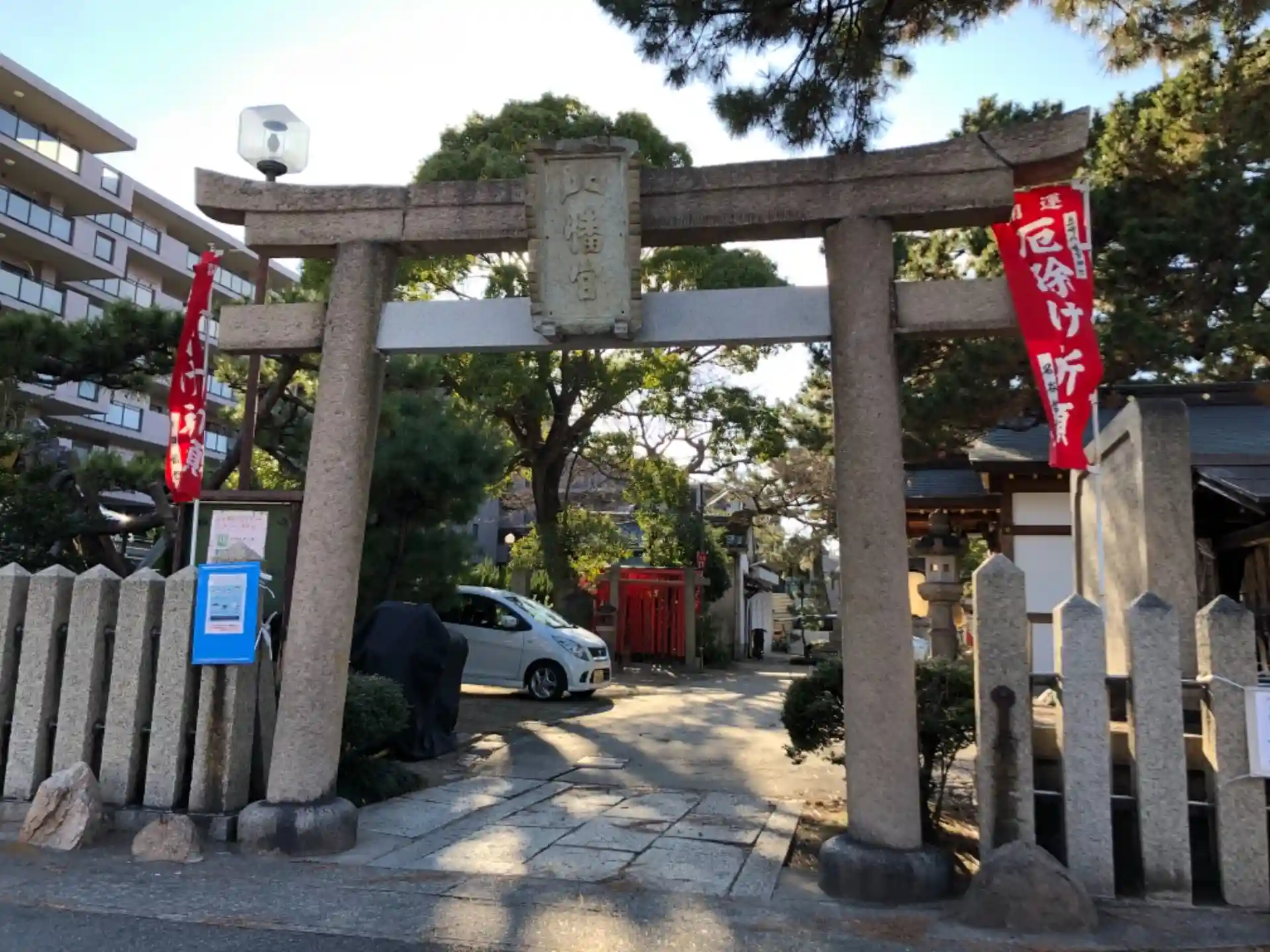今日の神社回りの最後は魚崎八幡宮神社に行ってきました。最初は車を何処に止めるのかわからなかったが、正面の赤い鳥居の所から入って空いている所に止めました。境内にはガレージがあり、月極駐車場になってました。
