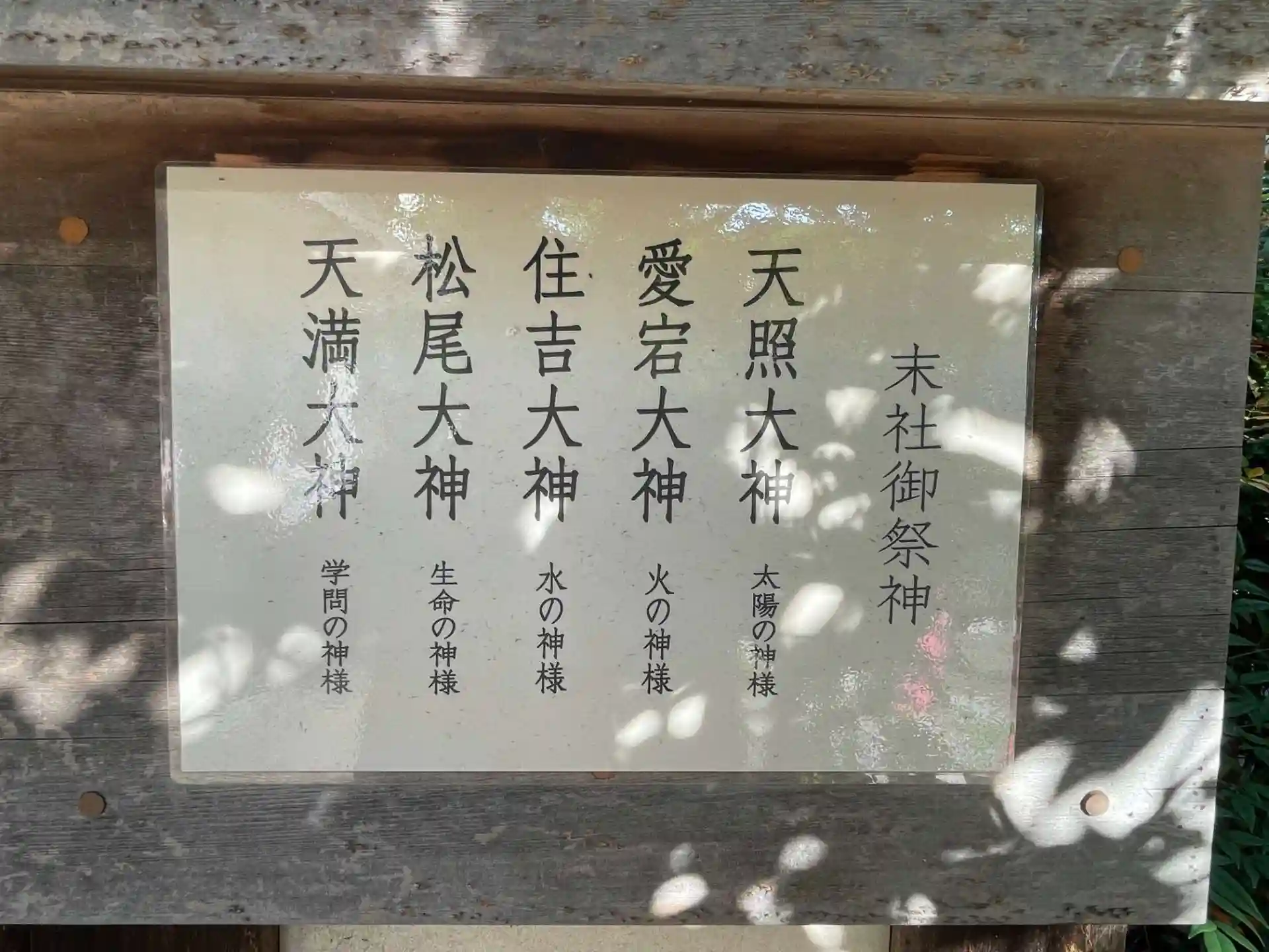 天照大神・愛宕大神・住吉大神・松尾大神・天満大神 よくお見掛けする祭神ですね。