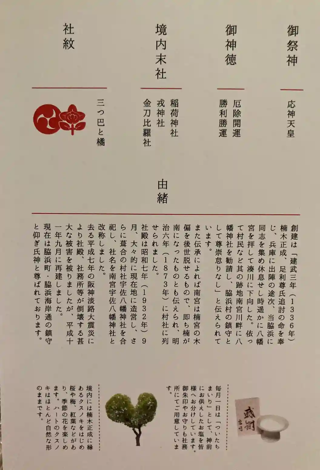 | ご由緒 | 創建は「建武三年(1336年)楠木正成、足利尊氏追討の命を奉じ、兵庫に出陣の途次、当脇浜に同志を集め休息せし時遥かに八幡宮を拝して湊川に下向した。依って村民など其の跡地南宮川畔に八幡神社を勧請し、脇浜村の鎮守として尊崇怠りなし」と伝えられています。