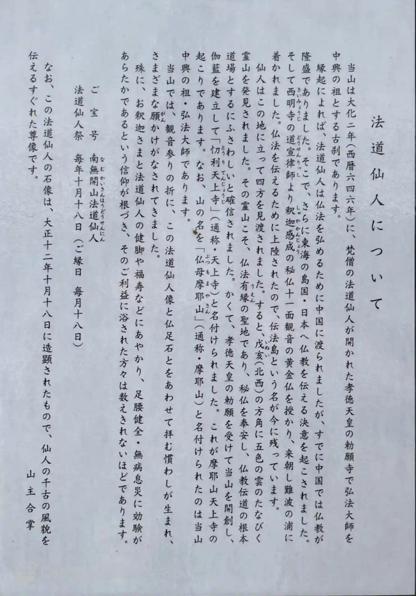 大化2年(646年)天竺の高僧法道仙人が孝徳天皇の勅願…