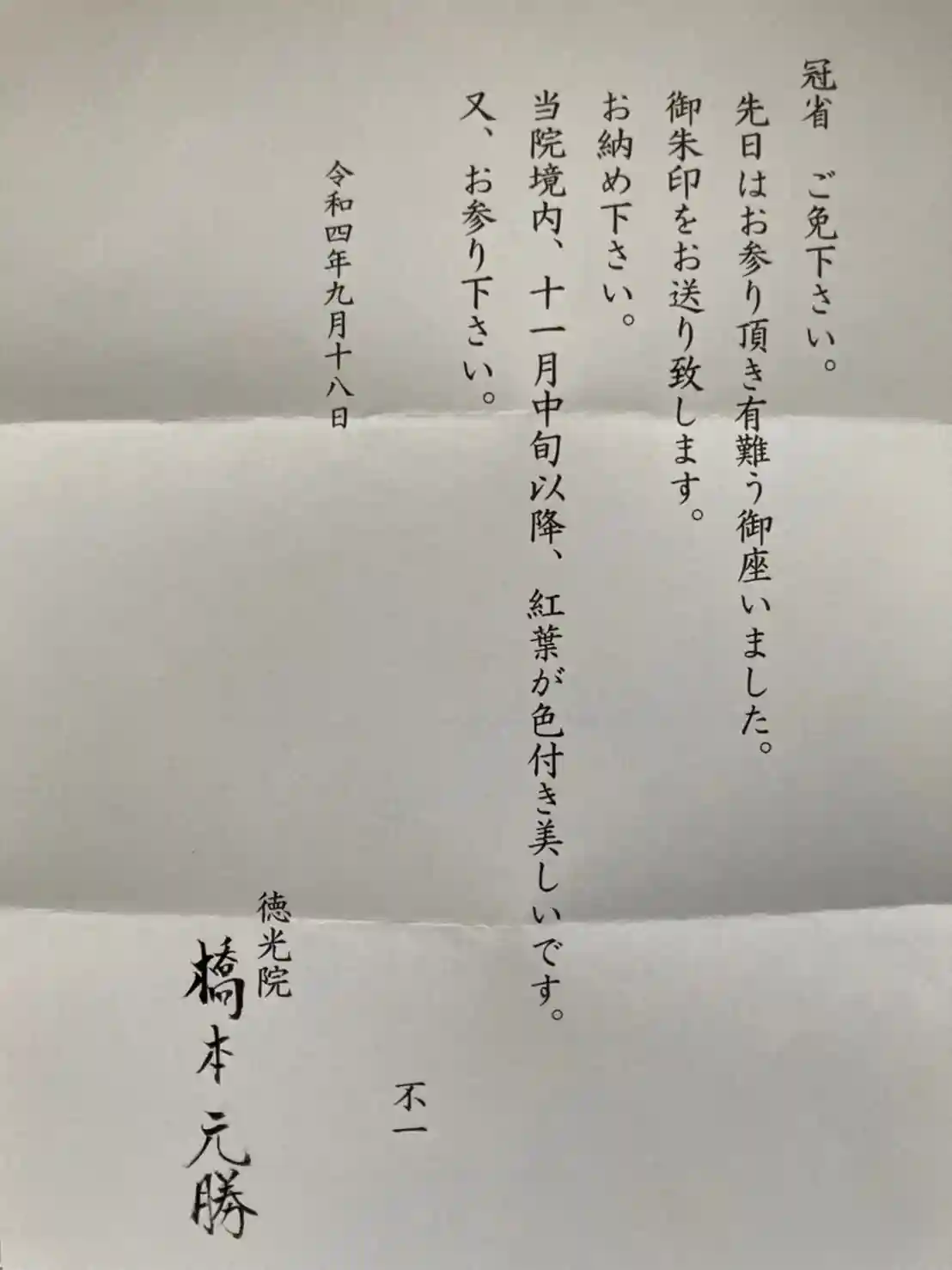 お参りさせて頂きました時にご住職がご不在で、奥様より郵送させて頂きますと、ご丁寧に御朱印をお送り戴きました。
