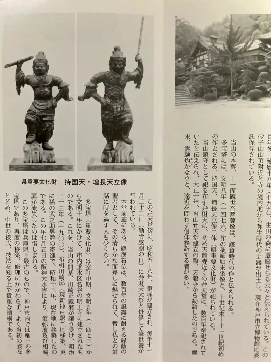その後、約五十年間に亘って、川崎家代々の庇護のもと、多宝塔、開山堂、弁天堂、茶室、納骨堂等々の建物を増やし、約四千坪(13,200平米)の境内地を擁する現在の輪奐が整えられたのである。 この地は、もとの布引滝勝寺(通称滝寺)の跡地といわれる。同寺の縁起に依ると、滝寺は文武天皇初年(697年頃)、役の小角が布引の滝において修法し、馬頭観音を祀り創建した寺で、一時七道伽藍、七十有余の僧房、末寺を有し、頗る隆盛を極めたと伝えられる。