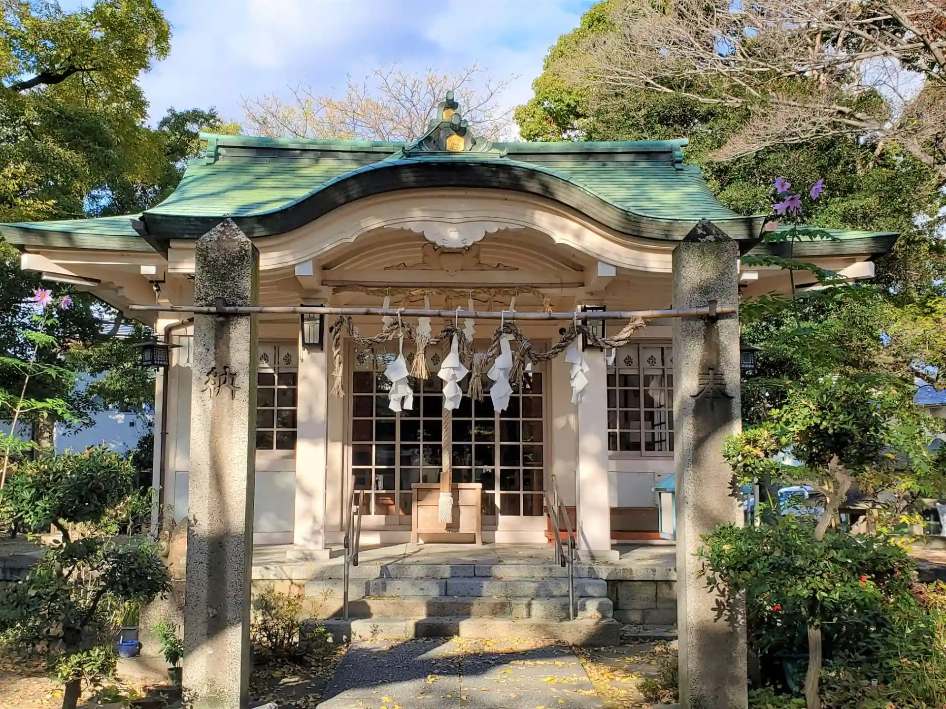 JR神戸線「甲子園口」駅から徒歩20分ほど、阪神電鉄「武庫川」駅から徒歩15分ほどの住宅街の中に鎮座しています。