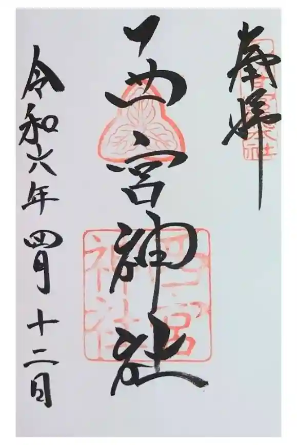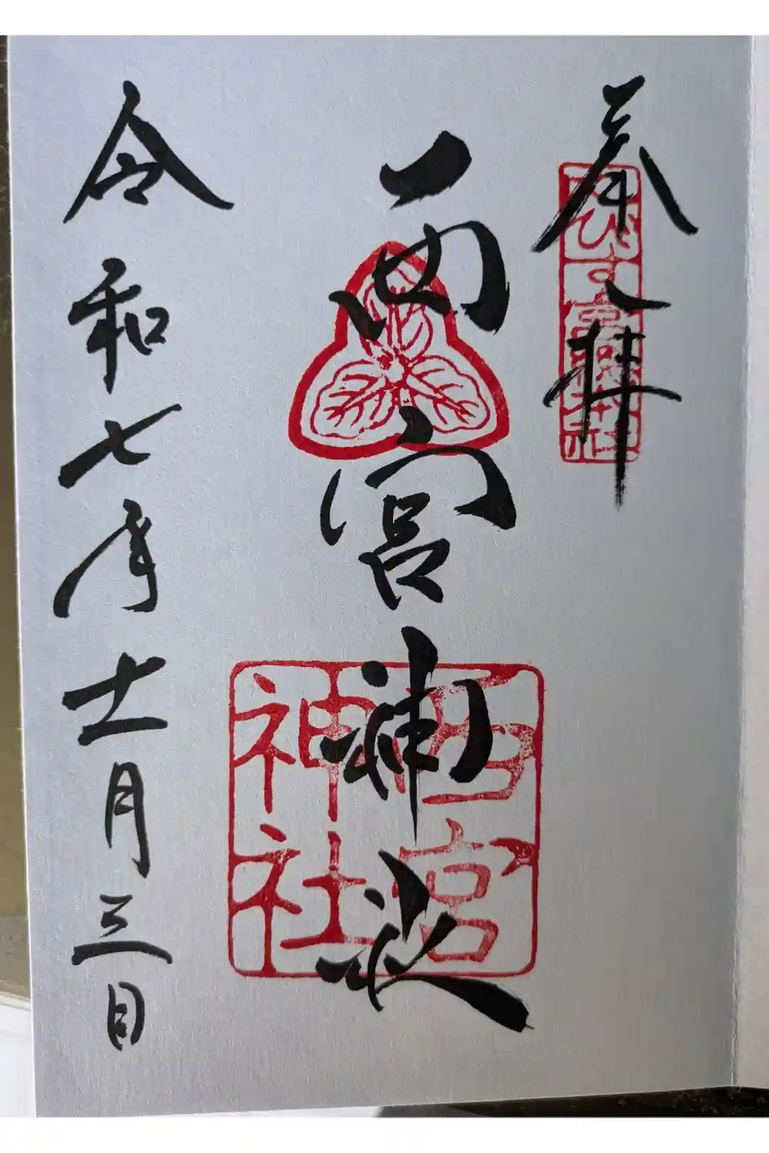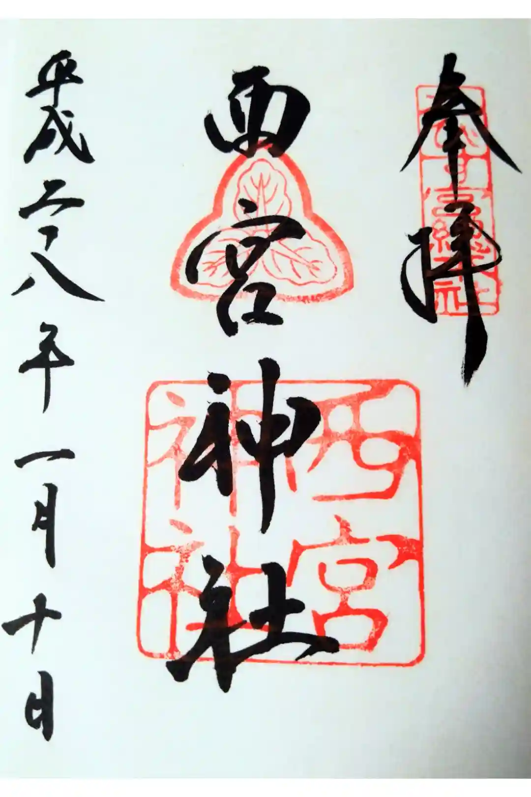 真ん中に西宮神社と書かれ、右上にえびす宮総本社の印、真ん中に神紋である三つ柏紋の印、下部に西宮神社の社印が押されています。