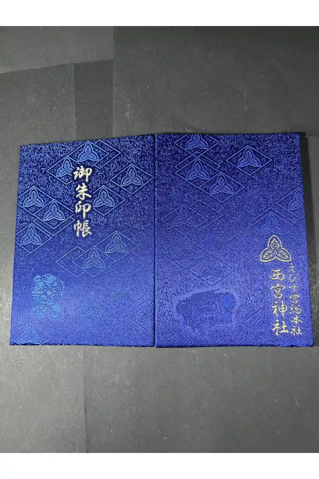 紺色の地に西宮神社の神紋である三つ柏紋が散りばめられ、表面は真ん中に御朱印帳の文字、左下に鯛を抱えた可愛らしいえびす様、裏面は左下に開門神事福男選びの様子が描かれ、右下に神紋とえびす宮総本社西宮神社の文字が入っています。