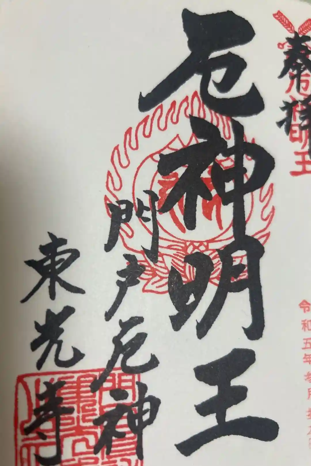 弘法大師にこの夢をお示しになると、大師は自ら白檀木に愛染明王と不動明王が一体となった明王像を3体、刻み祭られました。そのうち1体が東光寺に伝わる厄神明王さまです。その御姿が厄除の護符に描かれ天下に広まりました。