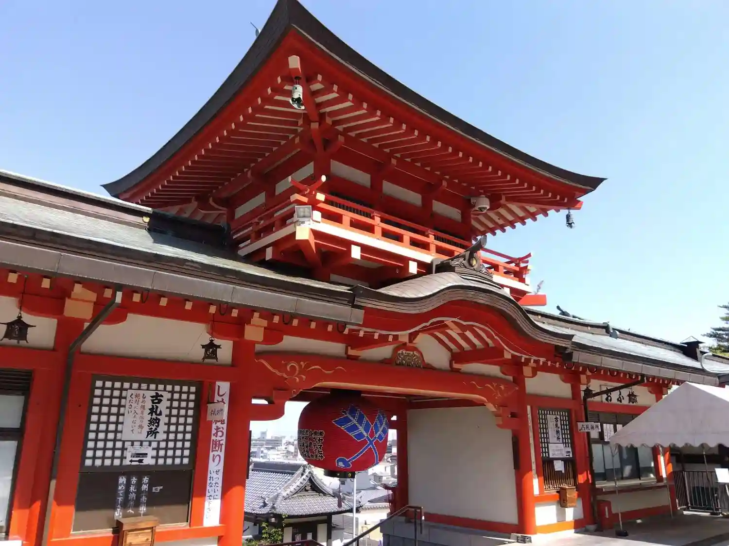 朱塗りの門に大きな提灯が印象的です