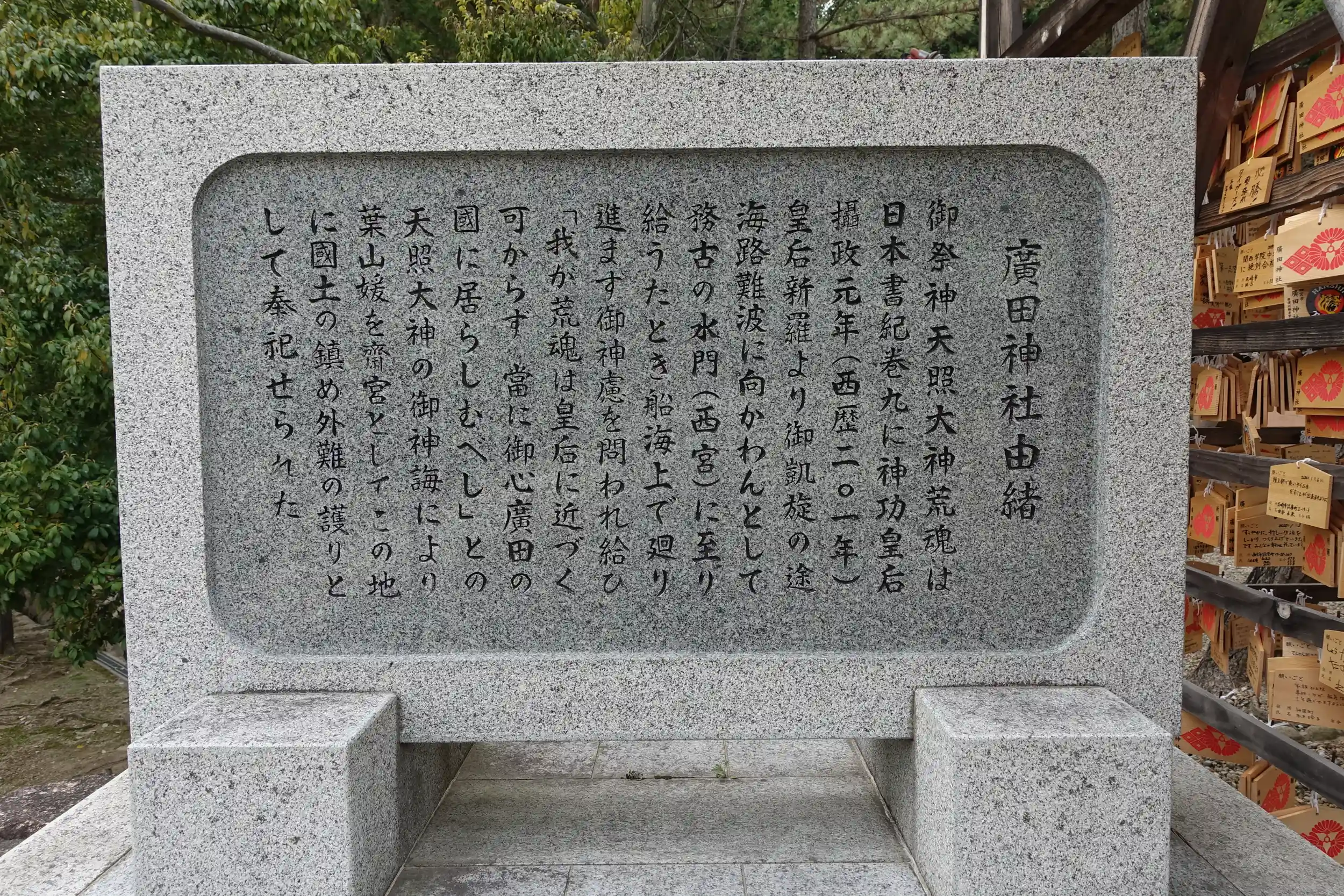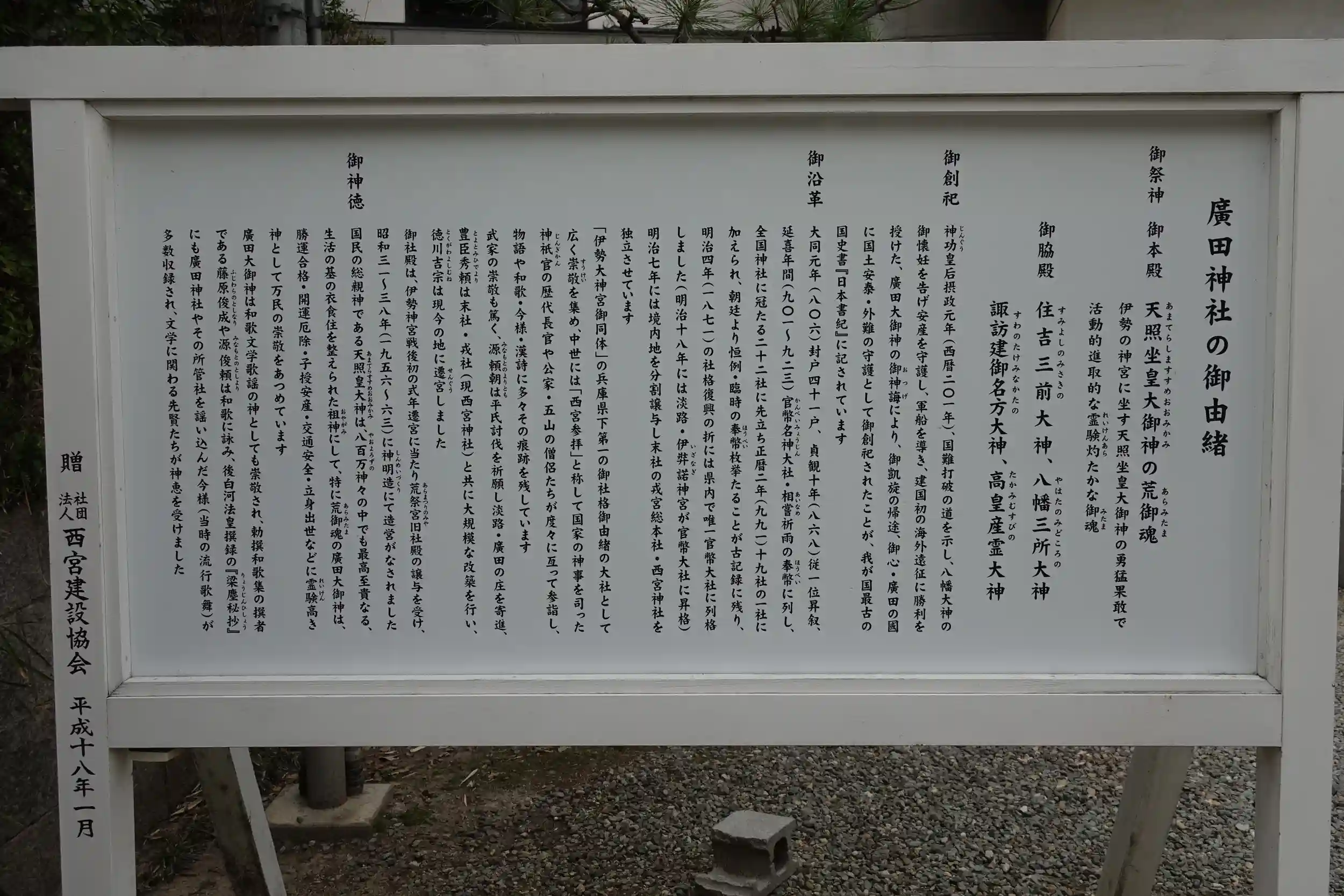 神功皇后摂政元年(201年)三韓征伐に出発する際に天照大神の和魂が神功天皇を守り、荒魂が戦を助けると神託があった。凱旋後、あらためて天照大神より神託があり、廣田国に荒魂を祀り創建したと日本書紀に記載がある。