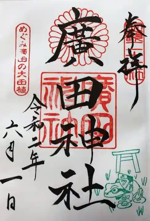 右から「近畿二十二社」印、真ん中に神紋と神社印、左上に「めぐみ廣田の大田植」印が押されています。
