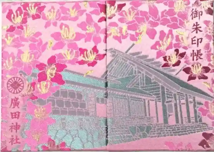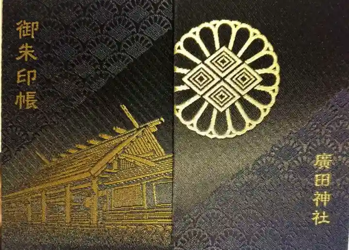 表面に「御朱印帳」の文字と拝殿が刺繍され、裏面に神紋(菊紋と三分割菱紋)と「廣田神社」と刺繍されています。