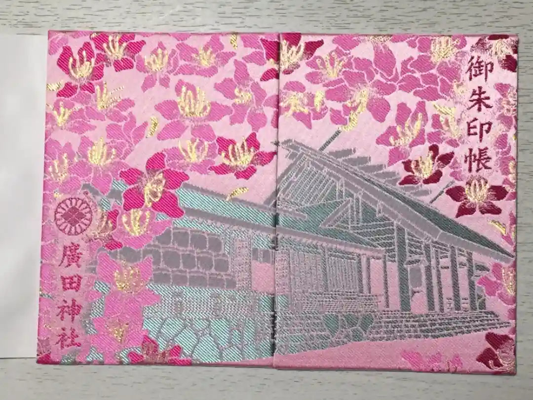 表面に「御朱印帳」の文字と拝殿が刺繍され、裏面に神紋(菊紋と三分割菱紋)と「廣田神社」と刺繍されています。