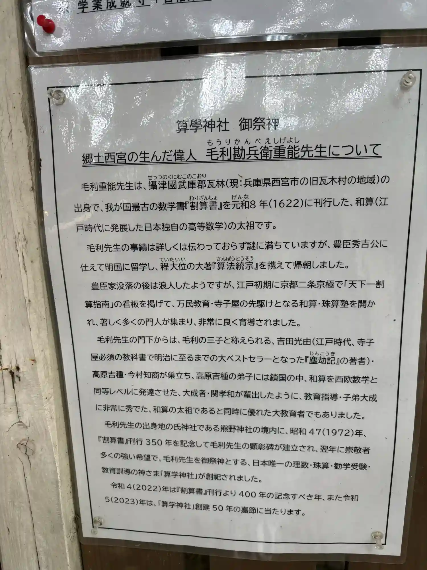 さらにその奥には算学神社にも祀られている江戸時代の和算家「毛利重能」の顕彰碑、顕彰碑と算学神社の間には「和算顕彰碑」もあります。