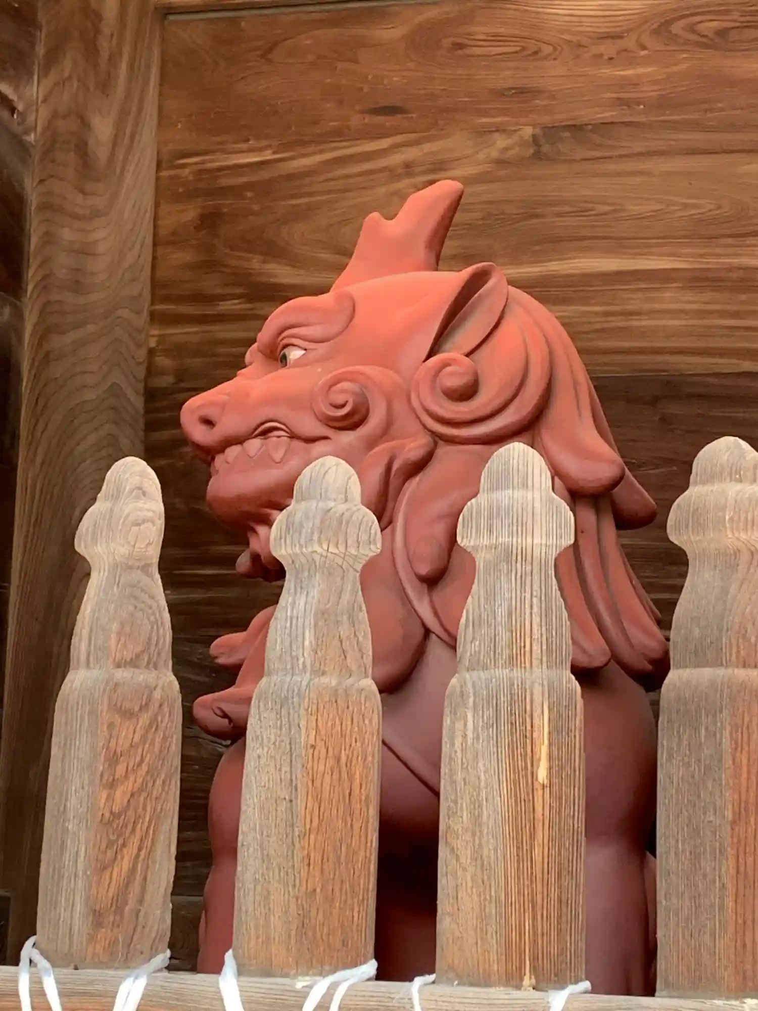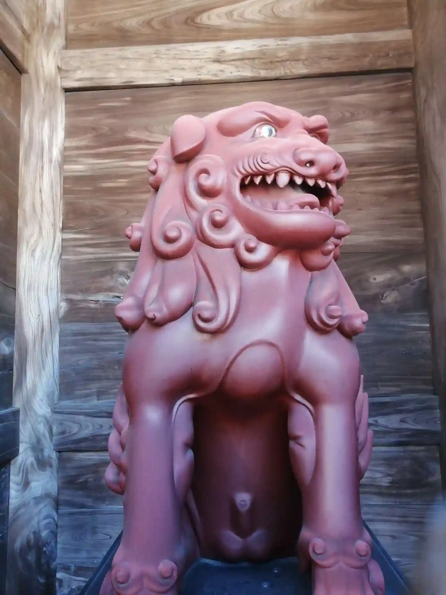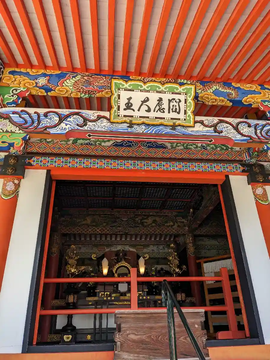 山門裏に置かれている狛犬は、製作当時の色彩を再現したものらし…