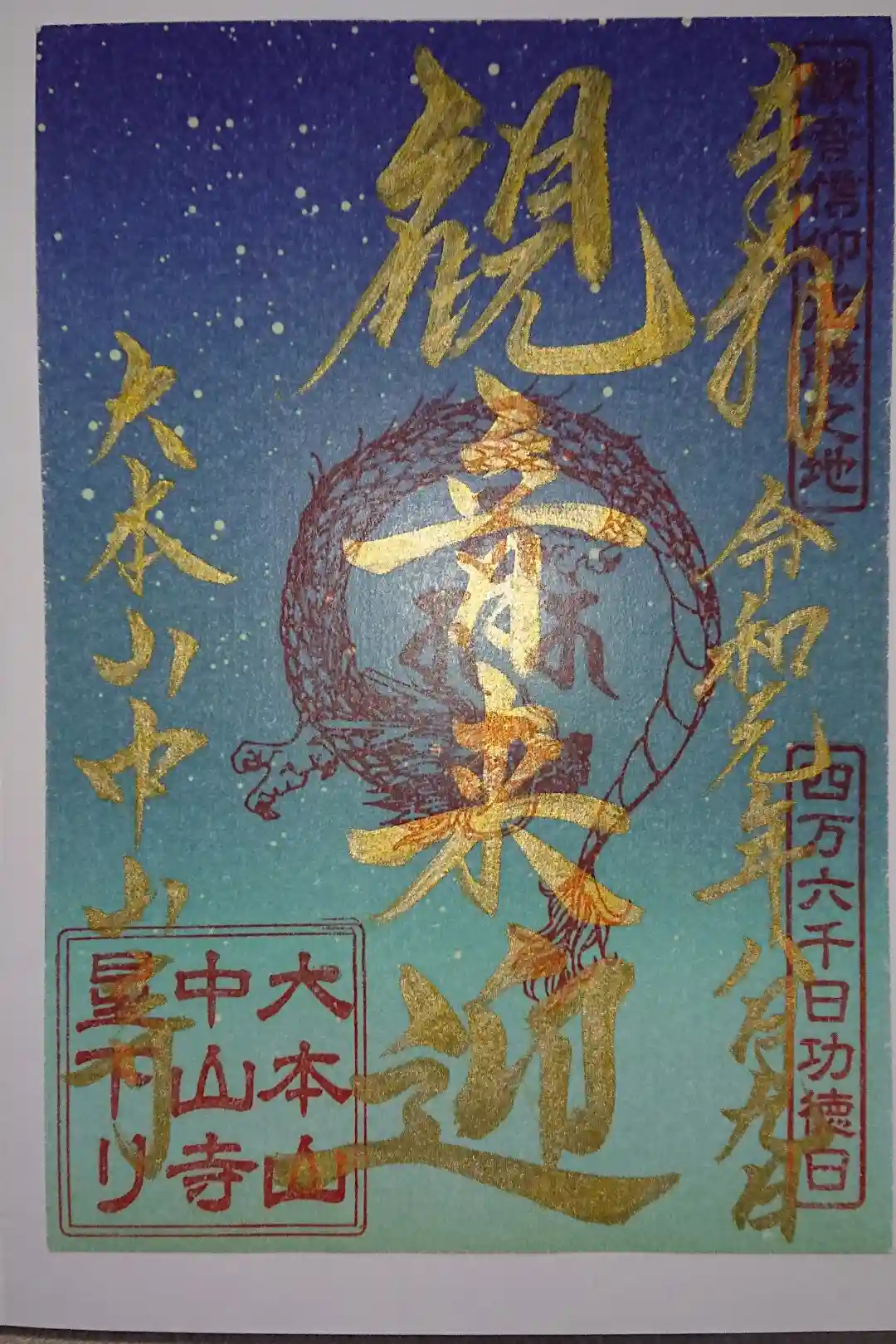 星の降る夜を表現した地に、真ん中に観音来迎と金字で書かれ、右上に観音信仰濫觴之地(かんのんしんこうらんしょうのち)、右下に四万六千日功徳日の印、真ん中に梵字(十一面観音)と龍の印、左に大本山中山寺の金字、左下に大本山中山寺星下りの印が押されています。