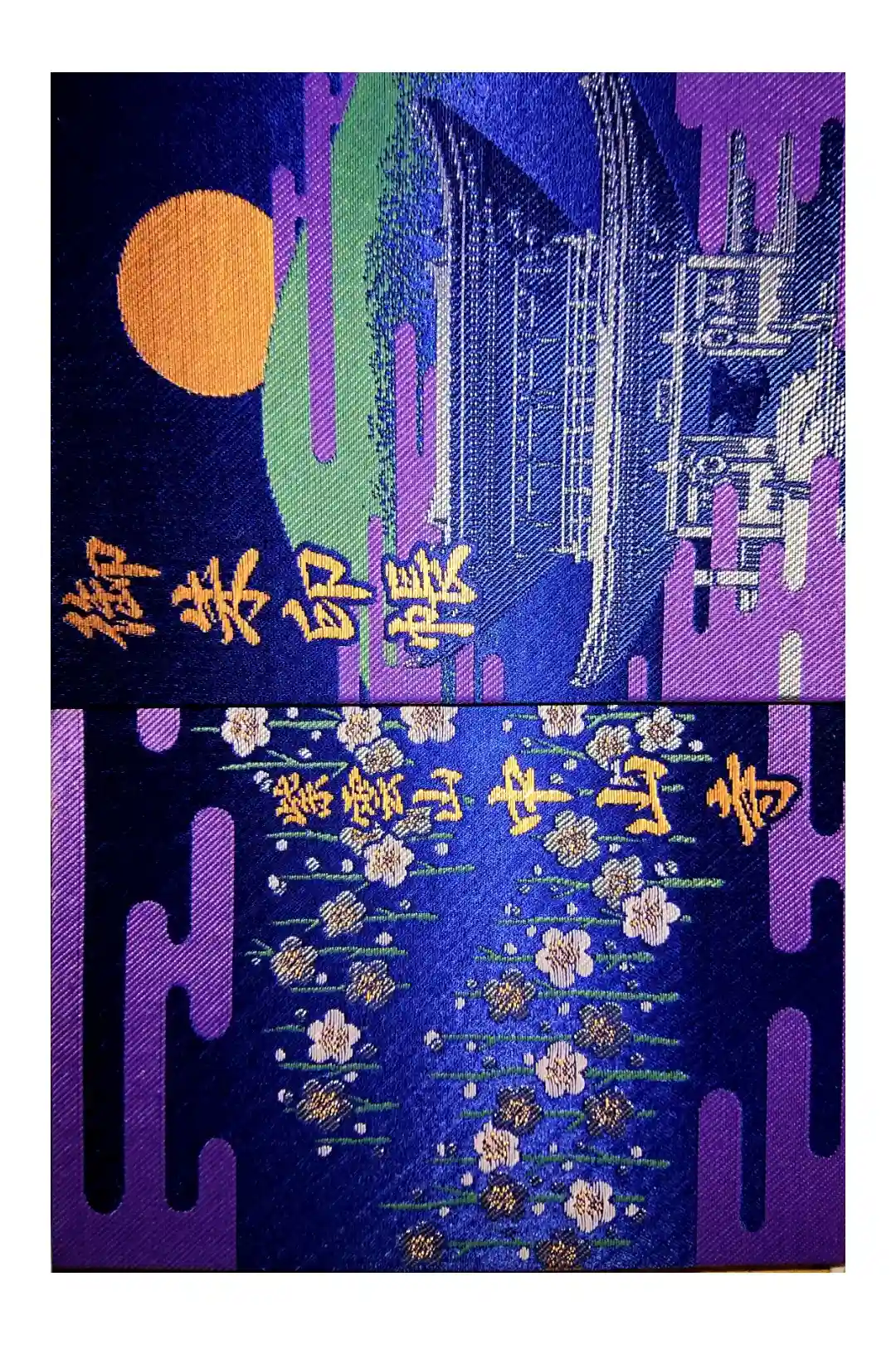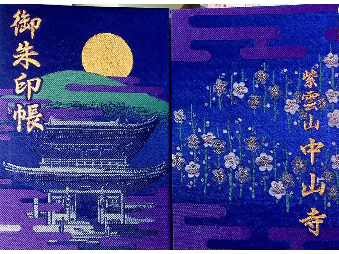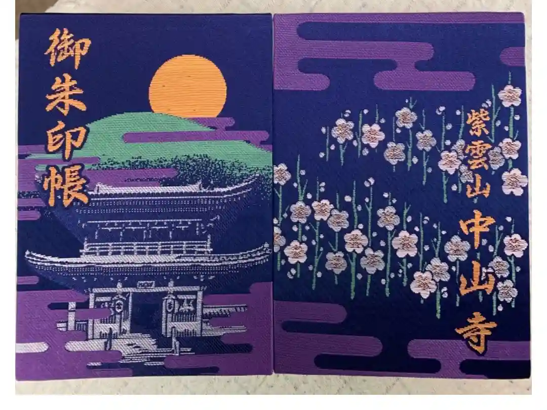 紫色の地に、表面は山門と月が描かれ、左上に御朱印帳の文字、裏面は梅の花と雲の和柄がデザインされ、右下に紫雲山中山寺の文字が入っています。