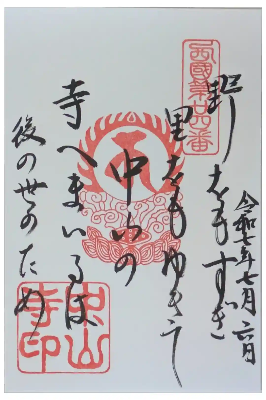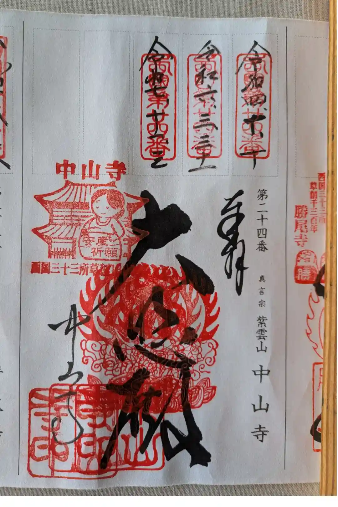 西国三十三所第二十四番札所御詠歌「野をもすぎ 里をもゆきて 中山の 寺へまいるは 後の世のため」と書かれ、右上に西国第廿四番の印、真ん中に梵字(十一面観音)と蓮華座に雲に乗った火炎宝珠の印、左上に西国三十三所草創1300年の印、左下に中山寺印が押されています。