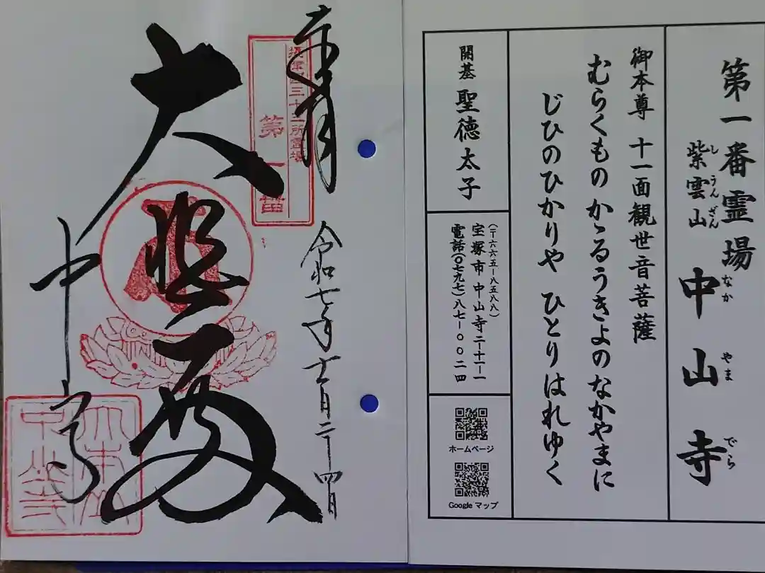 真ん中に十一面観世音と書かれ、右上に印、真ん中に梵字(十一面観音)の印、左下に中山寺の文字と大本山中山寺の印が押されています。