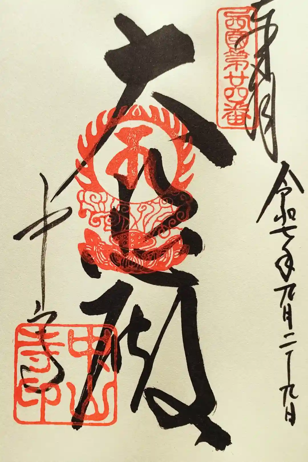真ん中に五大尊と書かれ、右上に梵字と近畿第二十一番の印、真ん中に梵字の印、左に中山寺の文字、左下に大本山中山寺の印が押されています。